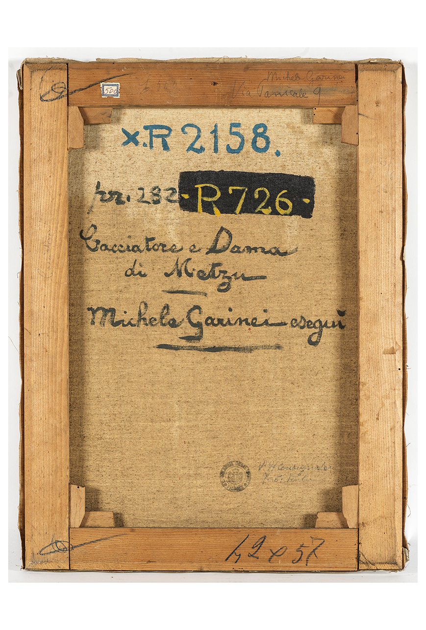 A sinistra un cacciatore saluta una dama, a destra, con gesto del cappello piumato che tiene con la mano destra. Nella sinistra impugna il fucile da caccia che appoggia alla spalla e la selvaggina. La donna indossa un abito con corpetto rosso e gonna bianca, e porta i capelli raccolti sotto una cuffia bianca annodata sotto il mento. Ambientazione domestica con armadio, poltrona, tavolo rivestito da tappeto rosso e suppellettili. La tela è tesa su telaio ma priva di cornice