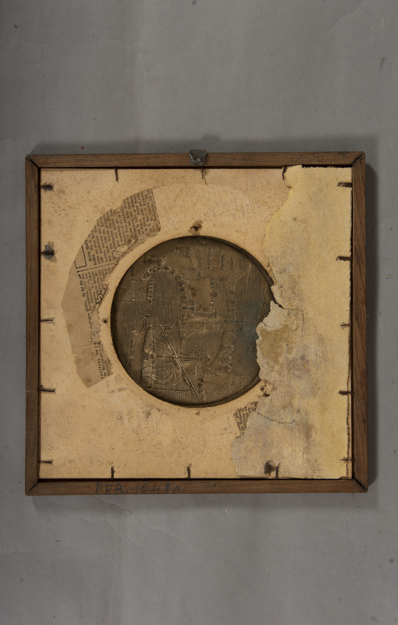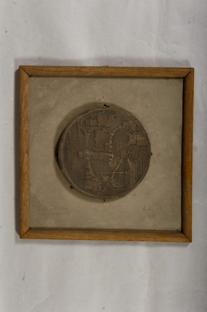 Medaglione uniface raffigurante veduta del porto di Rodi, con fari e fortezze e un veliero che entra nella baia a sinistra; montato su passepartout in cartoncino, dotato di sottile cornice a listello in legno chiaro e piccola attaccaglia