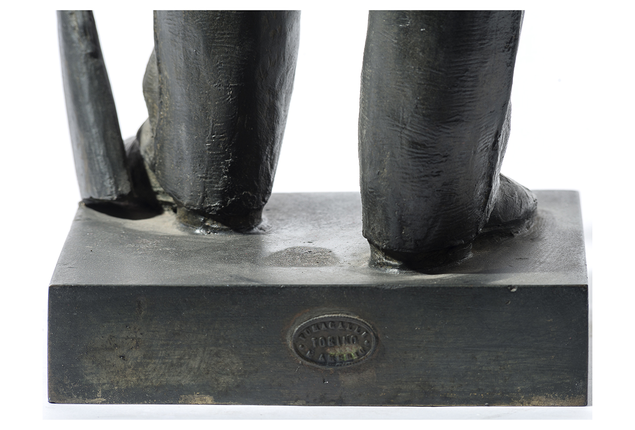 - NOTIZIE STORICO CRITICHE Il bronzetto è una copia in scala ridotta dell’ufficiale granatiere collocato sul monumento equestre di re Carlo Alberto di Savoia, eseguito tra il 1856 e il 1860 da Carlo Marocchetti (1805-1867) e posto nel 1861 sull’omonima piazza. Il monumento, assieme a varie figure allegoriche e bassorilievi celebrativi di vittoriose battaglie, rende difatti omaggio alle Forze Armate attraverso le sculture, poste sui quattro angoli, di altrettanti rappresentanti dell’Esercito Sardo. Il castello di Racconigi conserva copie di tutte e quattro gli ufficiali, tutte e quattro eseguite dalla ditta Fumagalli e Amerio di Torino. Dal punto di vista cronologico, dalla documentazione consultata non è stato possibile attribuire con certezza l’appartenenza delle quattro sculturine bronzee al progetto per l’erezione del monumento; è comunque indubbio che esse siano connesse tra loro e con la storia del monumento, e che pertanto vadano a collocarsi nella metà del secolo XIX. L`idea di erigere un monumento in onore di Carlo Alberto risale al 1847 sull’onda dell’entusiasmo suscitato dalle riforme politiche, in primis con la pubblicazione dello Statuto. Il dibattito si accese con la morte del Sovrano, nel 1849, che portò nel 1850 a nominare una commissione presieduta dal Ministro dei Lavori Pubblici Pietro Paleocapa. Si dovette però attendere fino al 20 maggio del 1856 per ottenere dalla Camera e dal Senato il voto che sancì la convenzione con Carlo Marocchetti, lo scultore scelto dal Ministero dei Lavori Pubblici per la realizzazione dell’opera, e lo stanziamento dei fondi necessari per la sua esecuzione. L’inaugurazione avvenne il 21 luglio del 1861, cioè pochi mesi dopo l’unificazione d’Italia. Della ditta Fumagalli e Amerio si hanno poche e scarne notizie, quasi tutte incentrate nella seconda dell’Ottocento. Tra i lavori più importanti, certamente la realizzazione della lapide, su disegno di Leonardo Bistolfi, dedicata al proclama di Camillo Benso di Cavour per Roma capitale del Regno d'Italia, apposta nel 1895 sulla facciata di Palazzo Carignano, nella piazza dunque antistante quella con il monumento a Carlo Alberto