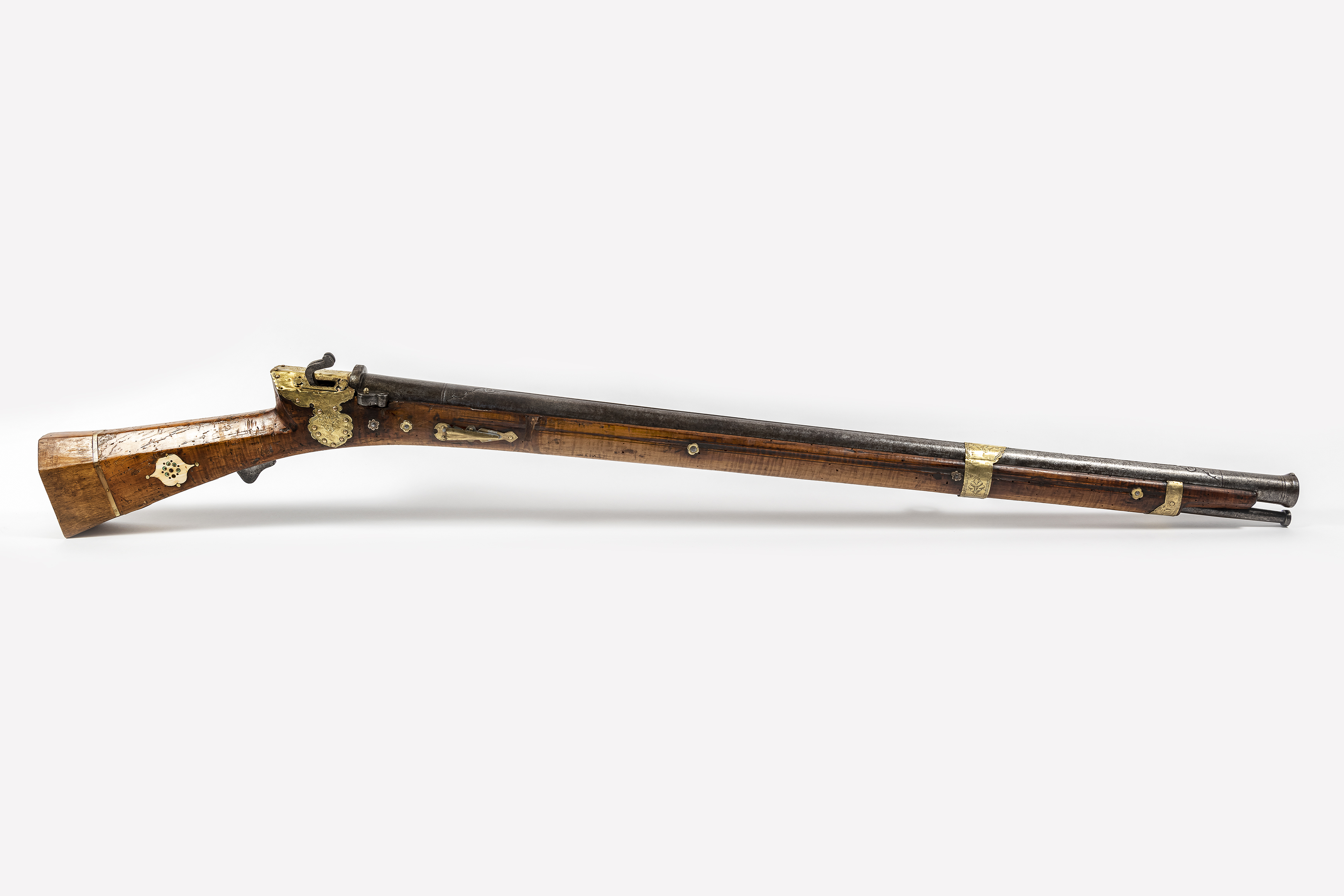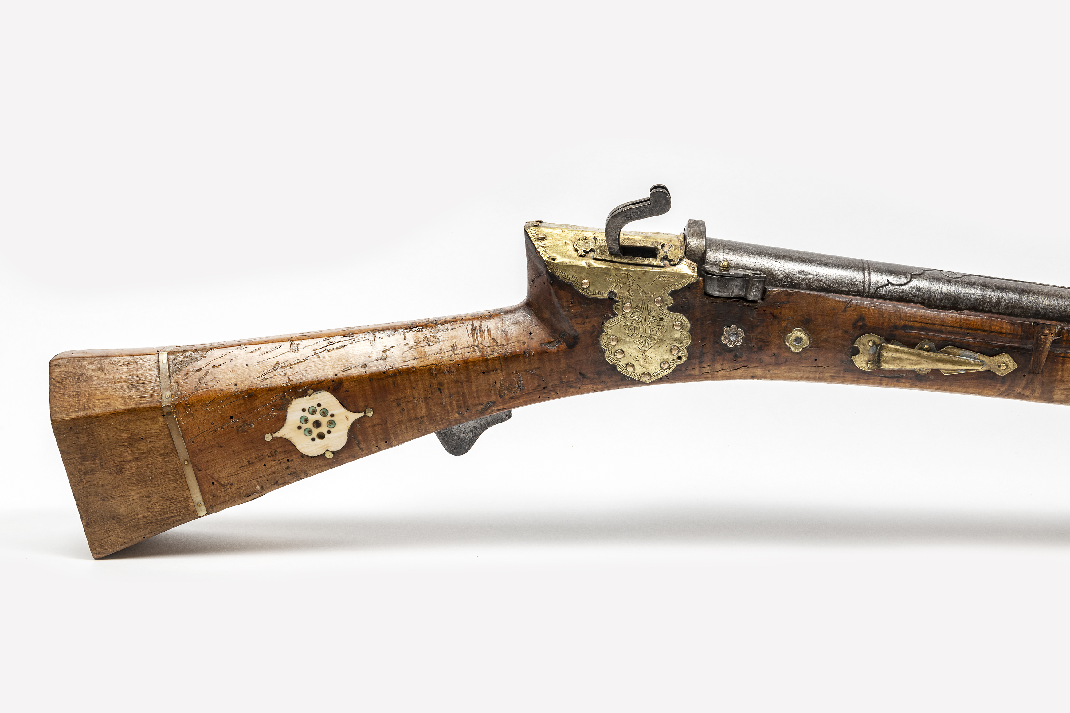 Fucile a miccia (tüfek). Attorno al calcio veniva arrotolata la miccia, mentre il serpentino agisce in una fenditura del calcio e il copriscodellino ruota su un perno. Cassa decorata con intarsio in legno più chiara e piccoli tondi in pasta vitrea o smalto, che similmente corrono sulla parte inferiore dove è alloggiata la canna. Quest’ultima presenta due fascette di fissaggio