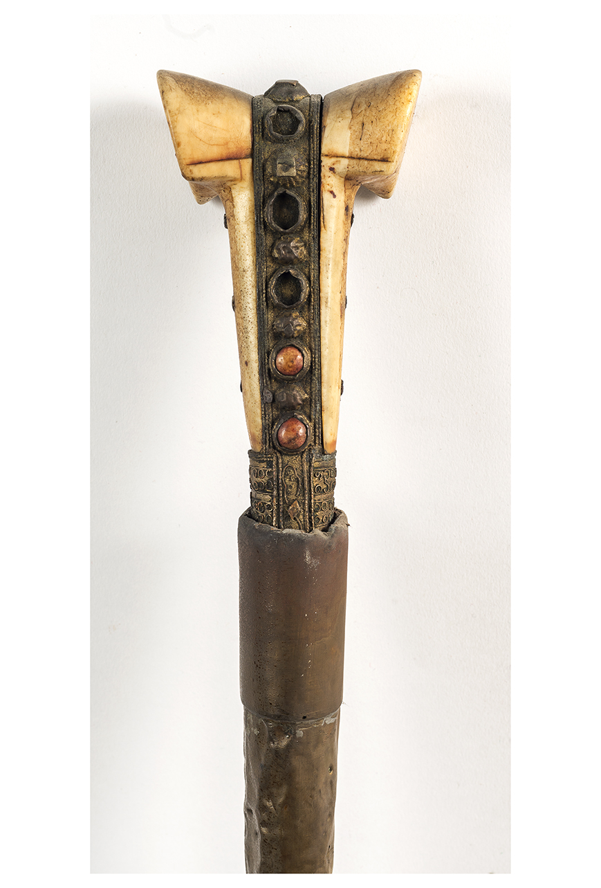 Coltellaccio con fodero in cuoio, ricoperto ad un terzo nella parte superiore ed inferiore in metallo dorato. L'impugnatura è in osso, con pietre colorate di rosso incastonate e, in prossimità della lama, decorato con metallo dorato