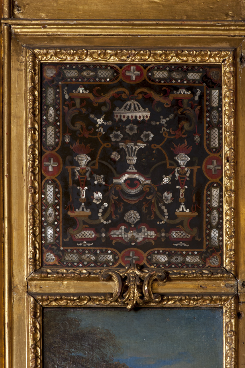 Pannello di formato rettangolare ornato con commesso di madreperla, pietre dure ed essenze lignee. E’ profilato da una cornice composta da elementi rettangolari alternati a ovali e ad altri motivi geometrici. In corrispondenza dei punti mediani di ciascun lato, elemento circolare contenente una croce greca in campo rosso. All’interno della cornice si articola una composizione simmetrica intorno a un vaso stilizzato centrale dal quale fuoriescono vari steli con fiori diversi. Al di sopra di esso, un baldacchino dal quale si dipartono festoni di foglie ed elementi circolari e volute. Il vaso poggia su un basamento curvilineo dal quale si sviluppano ornati a nastro piatto, elementi a voluta, fogliacei e floreali che si raccordano a due candelabre poggianti su basamenti. In basso al centro elemento decorativo a valva di conchiglia. Il pannello è inserito entro boiserie in legno dorato riccamente intagliata