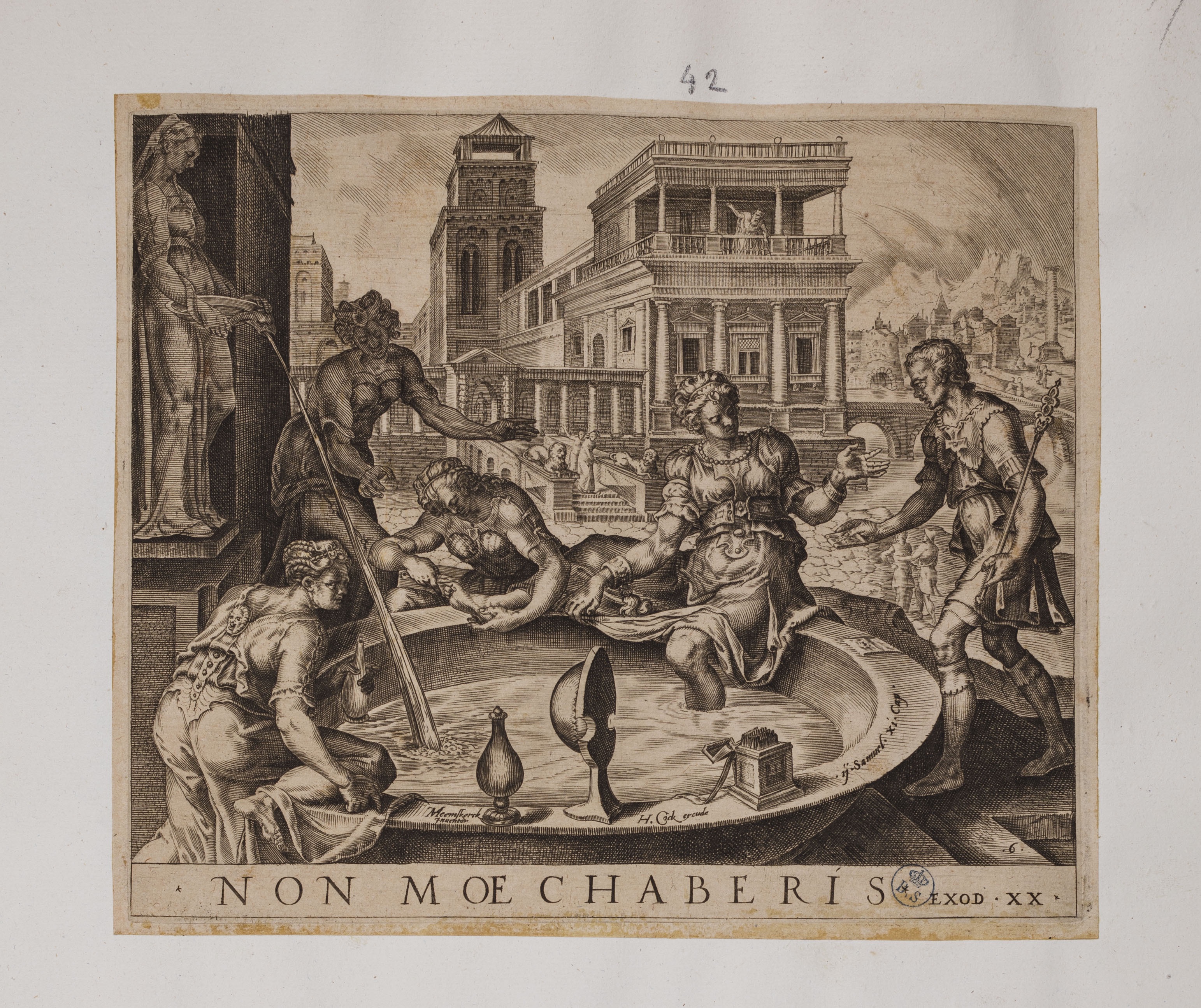 - NOTIZIE STORICO CRITICHE L’incisione, di Harmen Jansz. Muller, è la sesta di una serie di dieci stampe sul tema dei dieci comandamenti. Il sesto comandamento “non commettere adulterio” è rappresentato attraverso un episodio tratto dalla storia di Betsabea (2 Samuele 11, 2-4). Della serie, disegnata da Maarten van Heemskerck, conosciamo cinque edizioni. La prima - alla quale possiamo ricondurre l’incisione in scheda - venne pubblicata da Hieronymus Cock ad Anversa nel 1566 ca. Le altre, successive, sono rispettivamente di Philips, Theodoor e Johannes Galle (Anversa) e Claes Jansz. Visscher (Amsterdam). L’incisione fa parte di un album denominato “Album scuola fiamminga Van Voen Martino detto Hemeskerk”. Per mancanza di documenti non si conosce la collocazione precedente e la modalità di acquisizione da parte delle collezioni reali (poi Biblioteca Nazionale Universitaria di Torino) delle incisioni raccolte. Nel 1861 il conoscitore Giovanni Volpato, allora impegnato nel riordino delle collezioni grafiche dell’Accademia Albertina, viene chiamato a lavorare simultaneamente al fondo della Biblioteca Nazionale costituendo, sia per estensione sia per qualità, un nucleo rappresentativo della grande tradizione artistica italiana e straniera. Non è ancora stato possibile definire il lavoro di riordino nonostante si supponga che Volpato operò realizzando 52 album (Giovannini Luca, 2016). Unico documento che attesta la presenza degli album alla fine del 1800 è l’inventario redatto da Alessandro Baudi di Vesme (Antichi inventari 84). Oggi alcuni album, come quello preso in esame, restano testimonianza della collazione di incisioni realizzata da Volpato; molti altri dal 1970 vennero restaurati e smembrati, le incisioni sciolte vennero inserite in passepartout idonei alla conservazione, perdendone purtroppo l’integrità