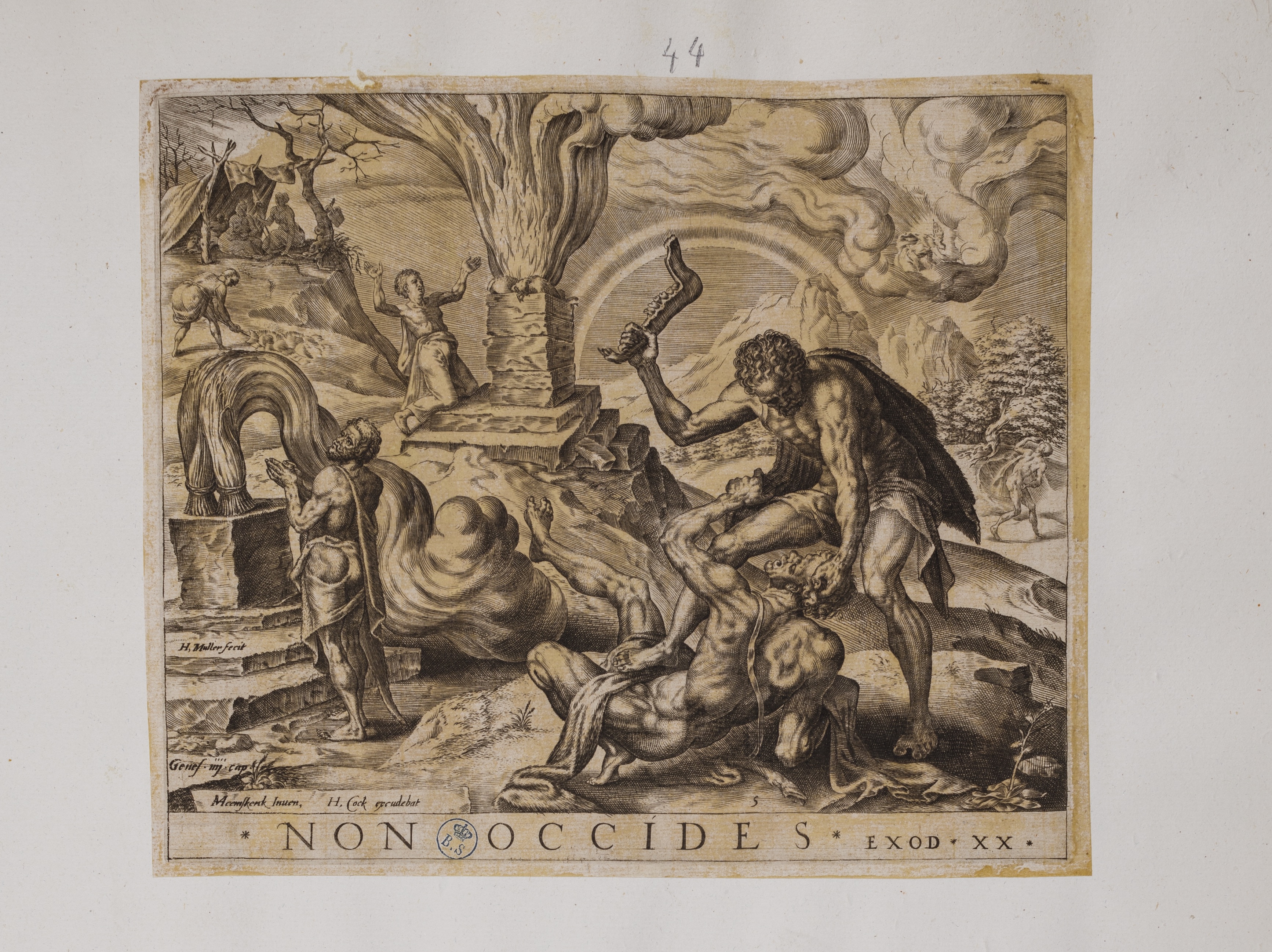 - NOTIZIE STORICO CRITICHE L’incisione, di Harmen Jansz. Muller, è la quinta di una serie di dieci stampe sul tema dei dieci comandamenti. Il quinto comandamento, “non uccidere”, è rappresentato attraverso un episodio tratto dalla storia di Caino e Abele (Genesi 4, 4-8). Della serie, disegnata da Maarten van Heemskerck, conosciamo cinque edizioni. La prima - alla quale possiamo ricondurre l’incisione in scheda - venne pubblicata da Hieronymus Cock ad Anversa nel 1566 ca. Le altre, successive, sono rispettivamente di Philips, Theodoor e Johannes Galle (Anversa) e Claes Jansz. Visscher (Amsterdam). Il disegno originale, datato 1566, è conservato presso il Courtauld Institute di Londra. L’incisione fa parte di un album denominato “Album scuola fiamminga Van Voen Martino detto Hemeskerk”. Per mancanza di documenti non si conosce la collocazione precedente e la modalità di acquisizione da parte delle collezioni reali (poi Biblioteca Nazionale Universitaria di Torino) delle incisioni raccolte. Nel 1861 il conoscitore Giovanni Volpato, allora impegnato nel riordino delle collezioni grafiche dell’Accademia Albertina, viene chiamato a lavorare simultaneamente al fondo della Biblioteca Nazionale costituendo, sia per estensione sia per qualità, un nucleo rappresentativo della grande tradizione artistica italiana e straniera. Non è ancora stato possibile definire il lavoro di riordino nonostante si supponga che Volpato operò realizzando 52 album (Giovannini Luca, 2016). Unico documento che attesta la presenza degli album alla fine del 1800 è l’inventario redatto da Alessandro Baudi di Vesme (Antichi inventari 84). Oggi alcuni album, come quello preso in esame, restano testimonianza della collazione di incisioni realizzata da Volpato; molti altri dal 1970 vennero restaurati e smembrati, le incisioni sciolte vennero inserite in passepartout idonei alla conservazione, perdendone purtroppo l’integrità