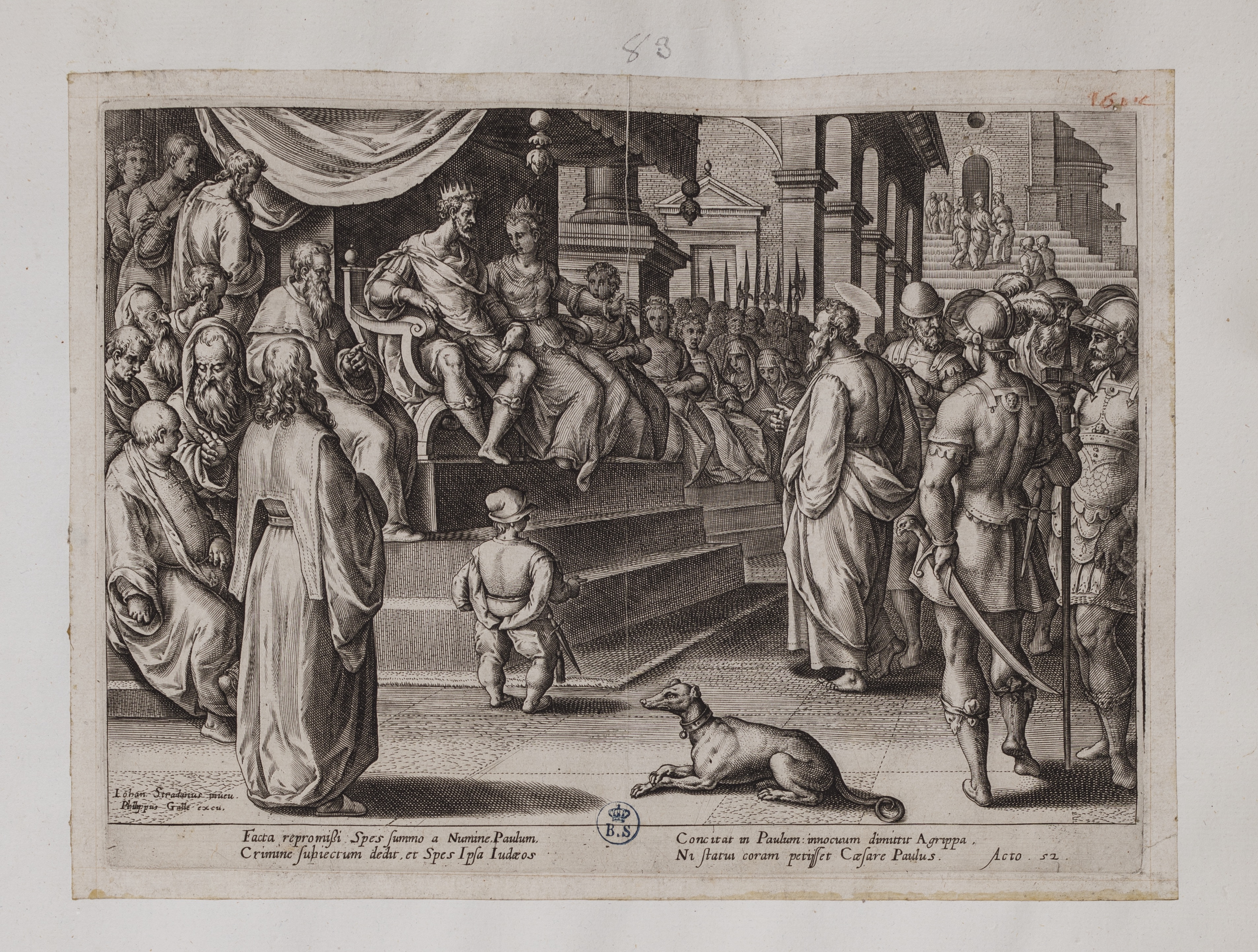 - ISCRIZIONI sul recto, bordo inferiore, su due colonne - Facta repromissi Spes summo a Numine Paulum / Crimine subiectum dedit, et Spes Ipsa Iudaeos / Concitat in Paulum: innocuum dimittur Agrippa, / Ni statui coram perifet Caesare Paulus Acto. 52 - Collaert Adriaen - numeri arabi -