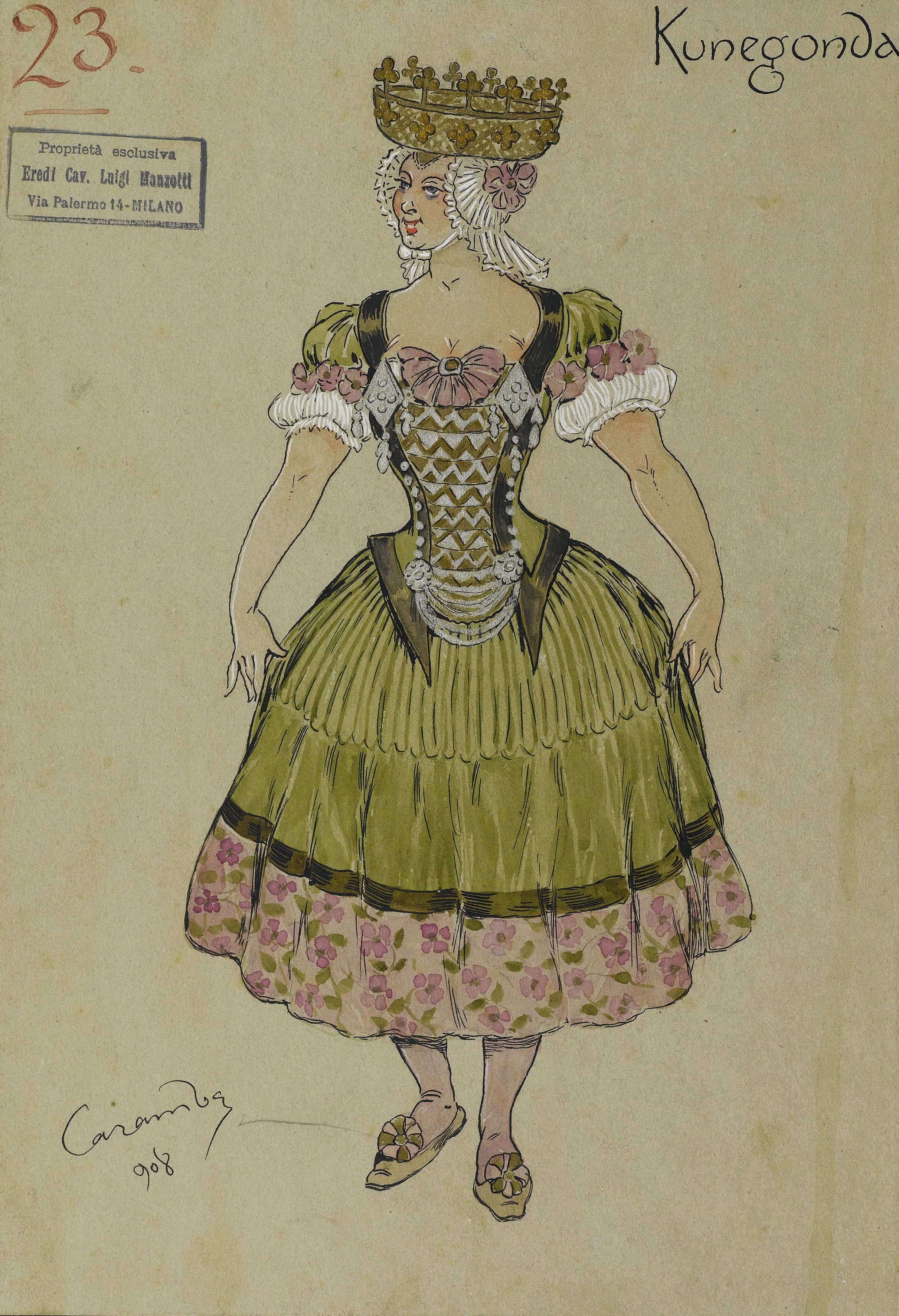 - NOTIZIE STORICO CRITICHE I trentaquattro figurini fanno parte dei costumi ideati per la riproposizione del 1909 del “Ballo Excelsior. Azione coreografica, storica e allegorica in sei parti ed undici quadri” di Luigi Manzotti e Romualdo Marenco, il celebre spettacolo mette in scena l’età del progresso e l’allegoria della modernità: a cavallo tra Otto e Novecento, attraverso lo sviluppo della scienza e della tecnica il genere umano è in grado di assicurarsi un avvenire di prosperità e progresso sociale. Presentato per la prima volta al Teatro La Scala di Milano nel 1881 con costumi di Alfredo Edel, ha una struttura narrativa in due parti in cui si alternano sequenze coreografiche e recitate, “Danza delle tenebre-rivelazione” e “Fama, Civiltà, Risorgimento”, e segna la cultura italiana come il prototipo di ballo pantomimico, fatto di grandi coreografie che attraverso una poderosa composizione per masse rappresentano la “titanica lotta sostenuta dal Progresso contro il Regresso”. Lo spettacolo ha un enorme successo, che continua dopo la morte degli autori. Fra 1908 e 1909 a ridisegnare i costumi del ballo in chiave simbolista, cogliendo le suggestioni internazionali dell’art nouveau, è lo scenografo e costumista Luigi Sapelli, detto Caramba (Pinerolo, 25 febbraio 1865 – Milano, 10 novembre 1936). Caramba è attivo come illustratore dall’ultimo quarto del XIX secolo a Torino, dove anima diversi periodici teatrali e umoristici (Buontempone, Re Pipino, Rivista velocipedistica, Il Giardinaggio), inventando un genere di critica teatrale che si serve di vignette umoristiche. A fine secolo passa alla Gazzetta del Popolo e al Fischietto, e viene designato dal caricaturista Casimiro Teja quale suo successore alla direzione del Pasquino, dove rimane fino al 1907. Esordisce come costumista teatrale a Colonia nel 1894 con il dramma lirico A basso porto, musicato da Nicola Spinelli. A Torino nel 1897 conosce Arturo Toscanini, col quale è destinato a collaborare nel 1922, e Ciro Scognamiglio, noto produttore napoletano di operette, con cui intraprende un percorso di rinnovamento della veste scenica di questo genere di spettacolo. Per l’Excelsior Caramba interviene sostituendo alcune invenzioni osannate nel testo originale ma ormai superate con le più recenti innovazioni della tecnologiche. Appassionato in prima persona di illuminotecnica, introduce nello spettacolo l’Elettricità e le applicazioni che essa rende possibili: Telegrafo, Telefono, Illuminazione elettrica…(cfr. Excelsior: documenti e saggi, a cura di Flavia Pappacena, Milano 1998; Elena Mosconi, L’impressione del film. Contributi per una storia culturale del cinema italiano (1895-1945), Milano 2006, pp. 55-74 e la relazione storico-critica allegata al provvedimento di tutela in FNT). Nel 1913 l'editore musicale Lorenzo Sonzogno decide di affidare al regista Luca Comerio una trasposizione filmica del Ballo, e la ripresa cinematografica sostanzialmente riprende l’edizione del Sapelli. Presso la Cineteca Nazionale di Roma sono sopravvissuti alcuni spezzoni con le coreografie del primo e secondo quadro, ma recentemente è stato rinvenuto negli archivi della Cineteca di Bologna un rullo in cui erano assemblati, oltre ai titoli di testa originali, diversi frammenti relativi a brani del film considerati perduti: di particolare interesse alcune riprese 'dal vero', la sequenza dedicata al traforo del Moncenisio e un segmento dell'apoteosi finale (http://www.cinetecadibologna.it/evp_100annifa_1913/programmazione/app_4981/from_2013-07-04/h_0915)