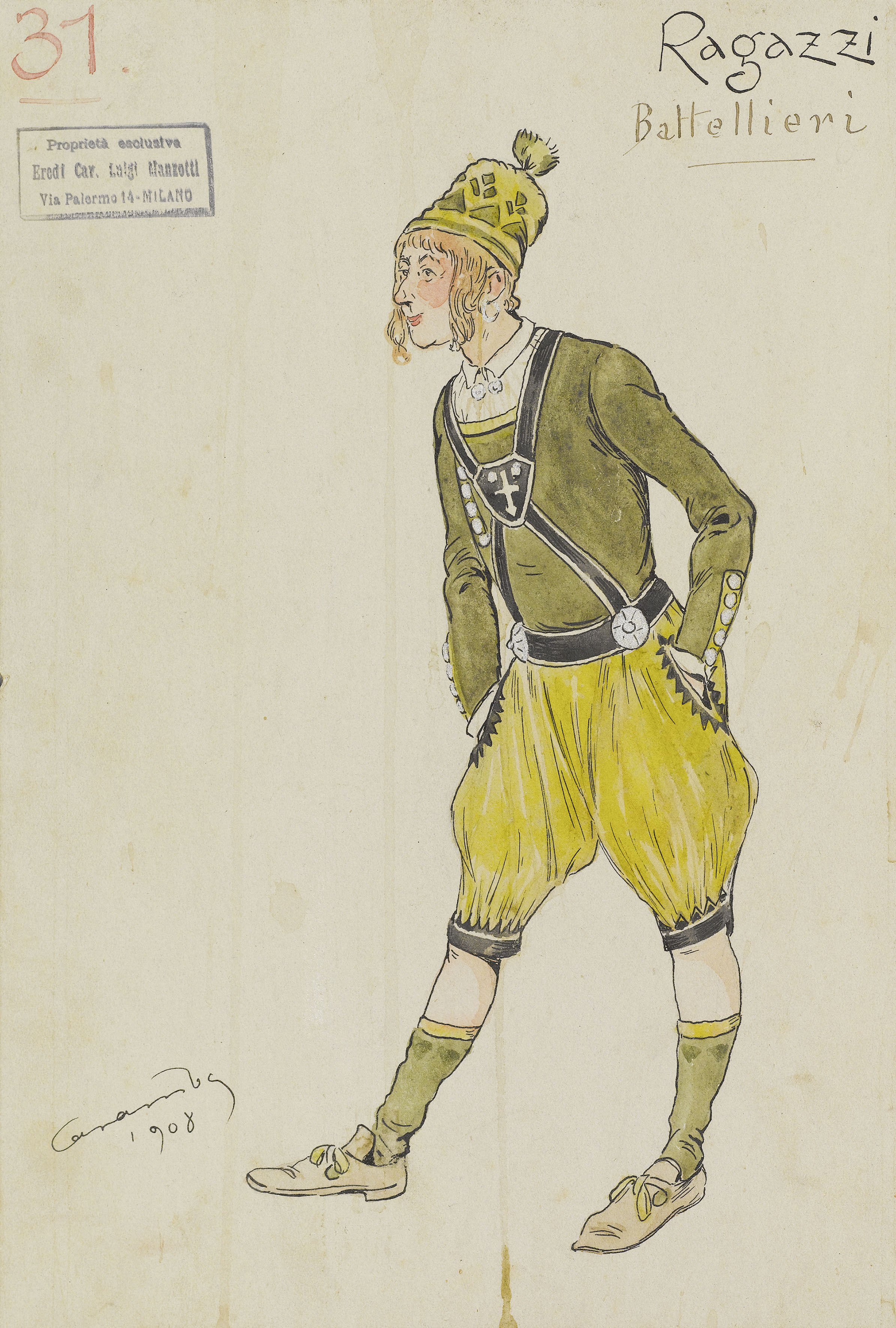 - NOTIZIE STORICO CRITICHE I trentaquattro figurini fanno parte dei costumi ideati per la riproposizione del 1909 del “Ballo Excelsior. Azione coreografica, storica e allegorica in sei parti ed undici quadri” di Luigi Manzotti e Romualdo Marenco, il celebre spettacolo mette in scena l’età del progresso e l’allegoria della modernità: a cavallo tra Otto e Novecento, attraverso lo sviluppo della scienza e della tecnica il genere umano è in grado di assicurarsi un avvenire di prosperità e progresso sociale. Presentato per la prima volta al Teatro La Scala di Milano nel 1881 con costumi di Alfredo Edel, ha una struttura narrativa in due parti in cui si alternano sequenze coreografiche e recitate, “Danza delle tenebre-rivelazione” e “Fama, Civiltà, Risorgimento”, e segna la cultura italiana come il prototipo di ballo pantomimico, fatto di grandi coreografie che attraverso una poderosa composizione per masse rappresentano la “titanica lotta sostenuta dal Progresso contro il Regresso”. Lo spettacolo ha un enorme successo, che continua dopo la morte degli autori. Fra 1908 e 1909 a ridisegnare i costumi del ballo in chiave simbolista, cogliendo le suggestioni internazionali dell’art nouveau, è lo scenografo e costumista Luigi Sapelli, detto Caramba (Pinerolo, 25 febbraio 1865 – Milano, 10 novembre 1936). Caramba è attivo come illustratore dall’ultimo quarto del XIX secolo a Torino, dove anima diversi periodici teatrali e umoristici (Buontempone, Re Pipino, Rivista velocipedistica, Il Giardinaggio), inventando un genere di critica teatrale che si serve di vignette umoristiche. A fine secolo passa alla Gazzetta del Popolo e al Fischietto, e viene designato dal caricaturista Casimiro Teja quale suo successore alla direzione del Pasquino, dove rimane fino al 1907. Esordisce come costumista teatrale a Colonia nel 1894 con il dramma lirico A basso porto, musicato da Nicola Spinelli. A Torino nel 1897 conosce Arturo Toscanini, col quale è destinato a collaborare nel 1922, e Ciro Scognamiglio, noto produttore napoletano di operette, con cui intraprende un percorso di rinnovamento della veste scenica di questo genere di spettacolo. Per l’Excelsior Caramba interviene sostituendo alcune invenzioni osannate nel testo originale ma ormai superate con le più recenti innovazioni della tecnologiche. Appassionato in prima persona di illuminotecnica, introduce nello spettacolo l’Elettricità e le applicazioni che essa rende possibili: Telegrafo, Telefono, Illuminazione elettrica…(cfr. Excelsior: documenti e saggi, a cura di Flavia Pappacena, Milano 1998; Elena Mosconi, L’impressione del film. Contributi per una storia culturale del cinema italiano (1895-1945), Milano 2006, pp. 55-74 e la relazione storico-critica allegata al provvedimento di tutela in FNT). Nel 1913 l'editore musicale Lorenzo Sonzogno decide di affidare al regista Luca Comerio una trasposizione filmica del Ballo, e la ripresa cinematografica sostanzialmente riprende l’edizione del Sapelli. Presso la Cineteca Nazionale di Roma sono sopravvissuti alcuni spezzoni con le coreografie del primo e secondo quadro, ma recentemente è stato rinvenuto negli archivi della Cineteca di Bologna un rullo in cui erano assemblati, oltre ai titoli di testa originali, diversi frammenti relativi a brani del film considerati perduti: di particolare interesse alcune riprese 'dal vero', la sequenza dedicata al traforo del Moncenisio e un segmento dell'apoteosi finale (http://www.cinetecadibologna.it/evp_100annifa_1913/programmazione/app_4981/from_2013-07-04/h_0915)