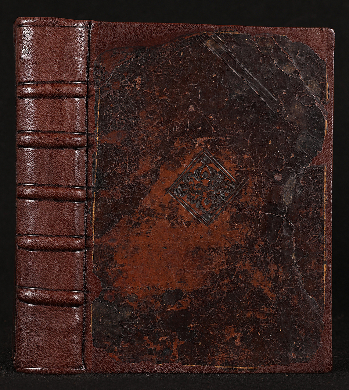 legatura rigida in pelle su supporto in cartone; legatura di restauro con riapplicazione della pelle originale dei piatti, decorati con cornice di filetto dorato; al centro dello specchio decoro a secco con composizione vegetale in losanga di doppio filetto. Dorso di restauro. Tagli grezzi. Labbri e unghiature di restauro. Etichetta di restauro applicata sul contropiatto inferiore