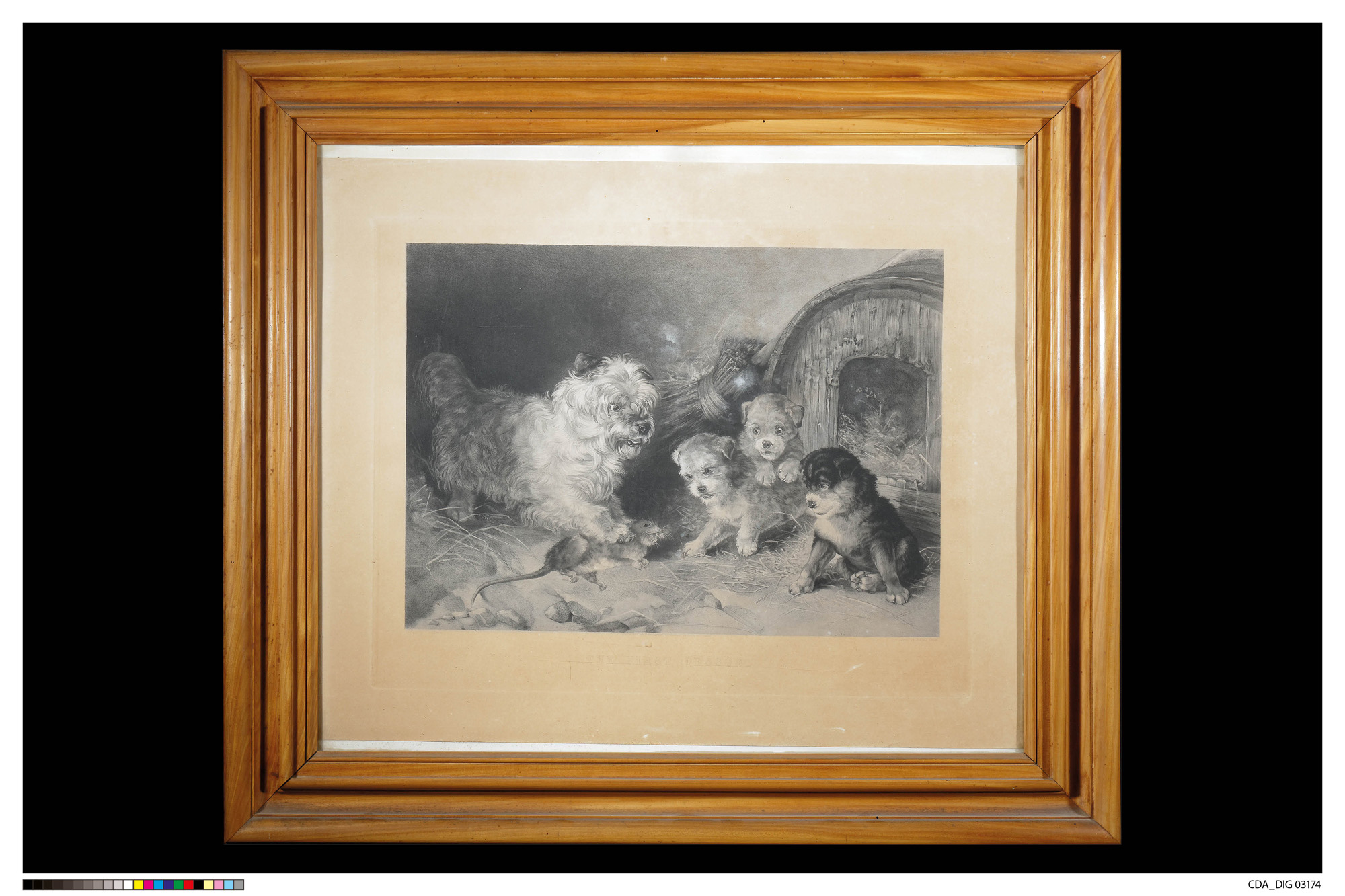 Animali: cane; tre cuccioli di cane; topo. Oggetti: cuccia; paglia; fascina di paglia