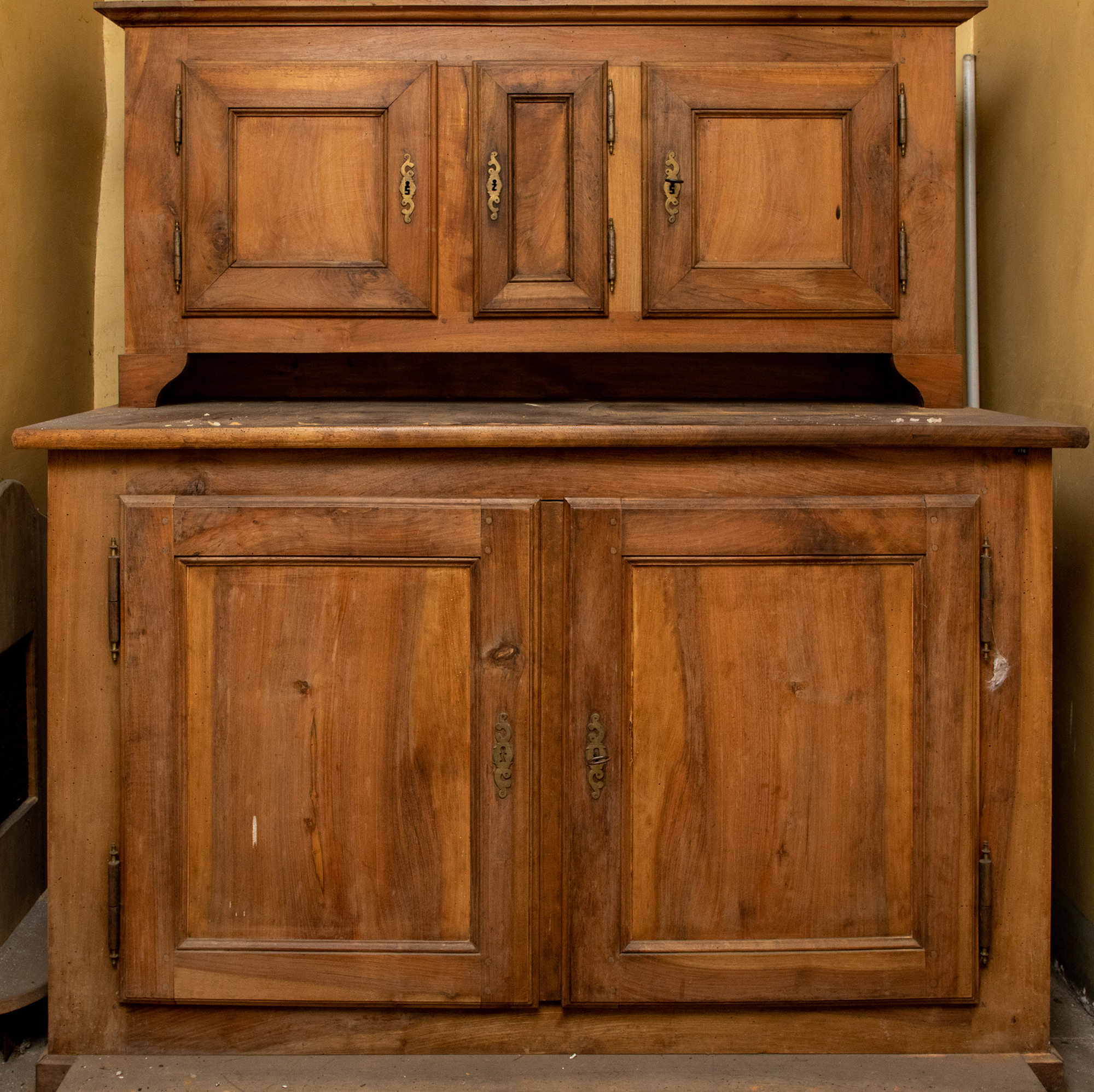 Armadio da sacrestia in legno di rovere e applicazioni in metallo dorato, parte inferiore a due sportelli e parte superiore a tre sportelli più piccoli con semplice riquadratura