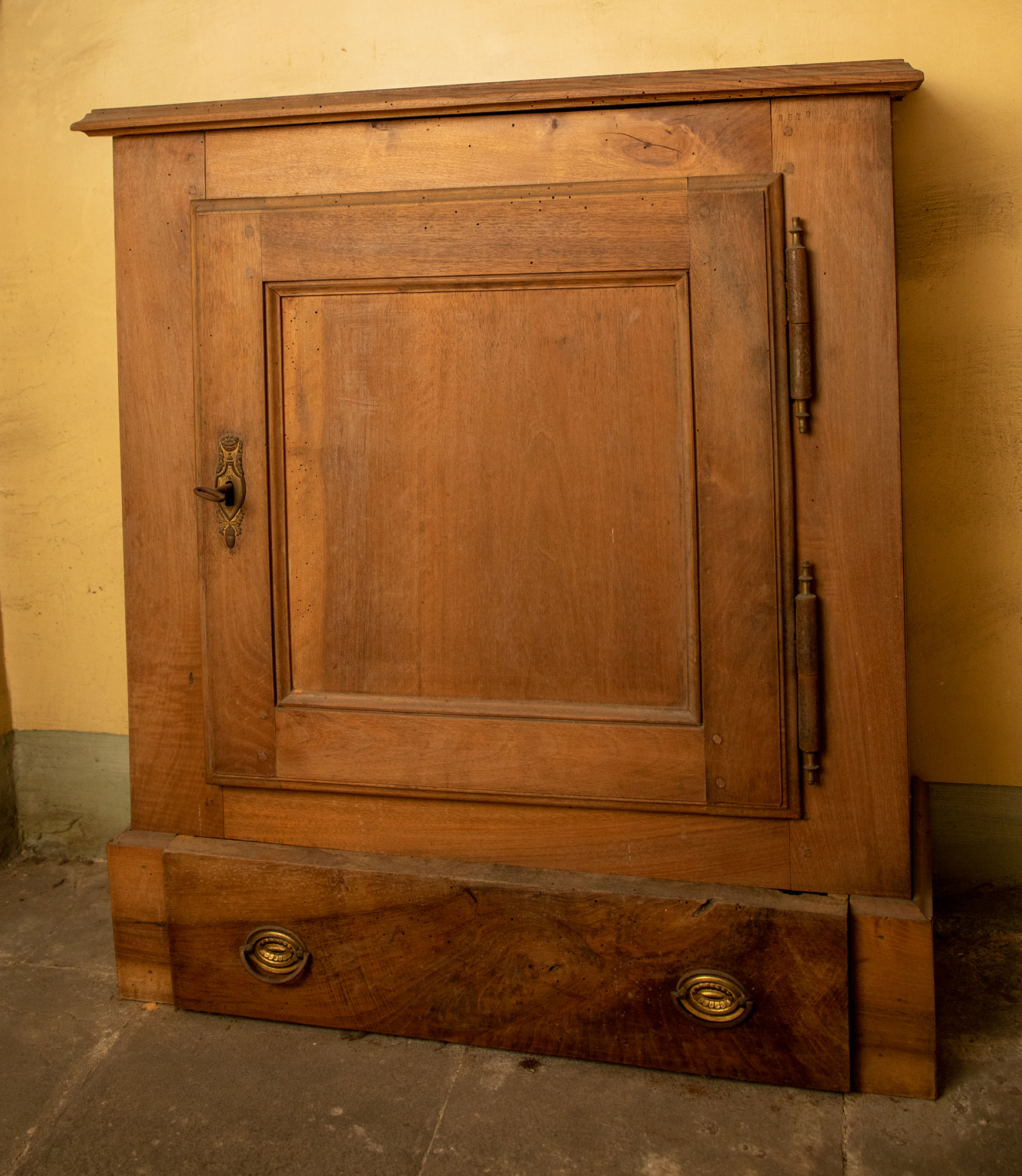 Armadietto in legno di noce con porticina e ripiano interno. Inginocchiatoio estraibile con mostrine in bronzo dorato