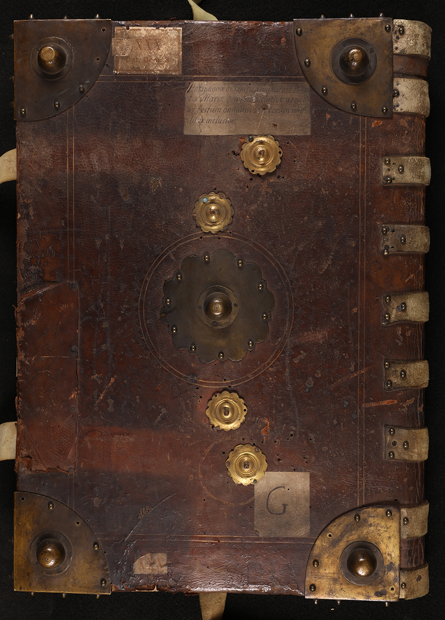 legatura rigida in pelle su assi di legno, decorata ai piatti con cornice esterna di fasci di filetto a secco; cornice dello specchio di doppio filetto dorato in fasci di filetto a secco; al centro dello specchio decoro circolare con motivo stilizzato a secco e doppio filetto dorato; cantonali a un quarto di cerchio con borchia emisferica e puntali periferici; al centro dello specchio umbone polilobato con borchia emisferica; su entrambi i piatti rinforzi in pelle ed etichette a stampa con numero di segnatura; al piatto inferiore etichette manoscritte con informazioni del contenuto e segnature antecedenti. Dorso a sette nervi doppi rilevati e sottolineati, rinforzati in pelle. Tagli grezzi. Tre segnacoli in pergamena. Quattro tenoni polilobati al piatto inferiore, a cui corrispondono quattro fibbie con asole polilobate