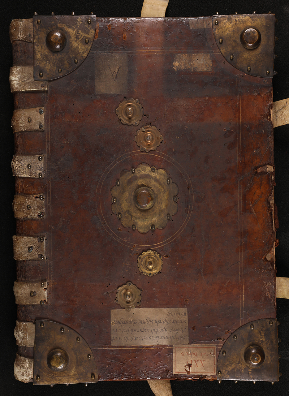 legatura rigida in pelle su assi di legno, decorata ai piatti con cornice esterna di fasci di filetto a secco; cornice dello specchio di doppio filetto dorato in fasci di filetto a secco; al centro dello specchio decoro circolare con motivo stilizzato a secco e doppio filetto dorato; cantonali a un quarto di cerchio con borchia emisferica e puntali periferici; al centro dello specchio umbone polilobato con borchia emisferica; al piatto superiore rinforzi in pelle ed etichetta a stampa con numero di segnatura; al piatto inferiore etichetta a stampa con numero di segnatura ed etichette manoscritte con informazioni del contenuto e segnature antecedenti. Dorso a sette nervi doppi rilevati e sottolineati, rinforzati in pelle. Tagli grezzi. Un segnacolo in pergamena. Quattro tenoni polilobati al piatto inferiore, a cui corrispondono quattro fibbie con asole polilobate