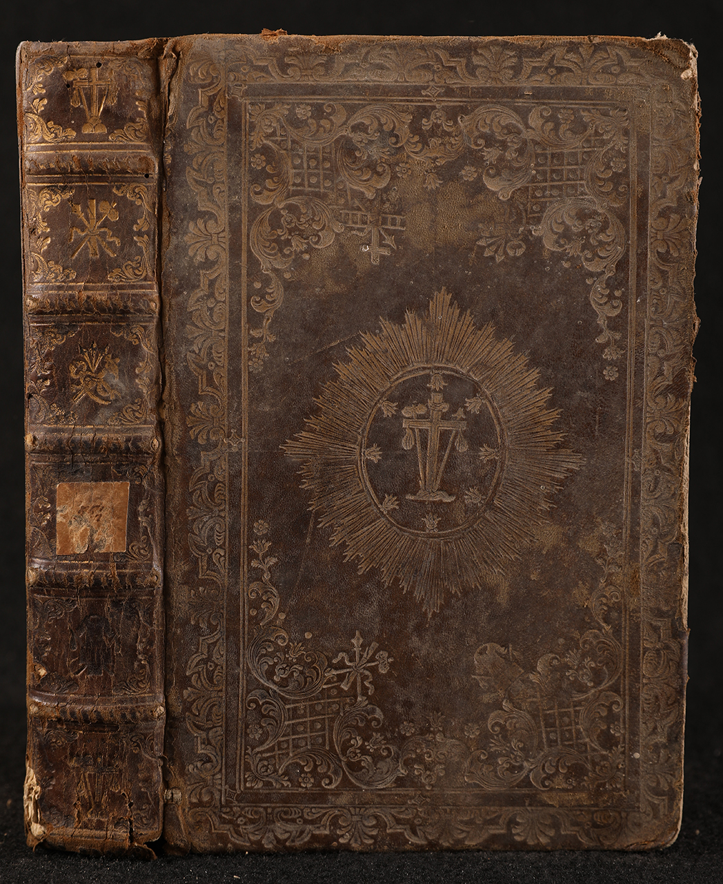 legatura rigida in pelle su supporto in cartone, decorata ai piatti in oro con cornice esterna a motivo mistilineo, elementi vegetali e palmette su filetto, ferro a losanga accantonato internamente e al centro dei lati; cornice dello specchio di doppio filetto raccordato agli angoli, grandi cartelle rococò con graticcio di punti accantonate internamente, sormontate da differenti simboli della Passione; al centro dello specchio ovale raggiato con croce e simboli della Passione. Dorso a cinque nervi rilevati e sottolineati, caselle decorate in oro ognuna con simboli diversi della Passione; traccia di etichetta con numero manoscritto in quarta casella. Tagli dorati. Controguardie in carta marmorizzata. Nota manoscritta sul verso del foglio di guardia superiore. Timbro di possesso sul frontespizio
