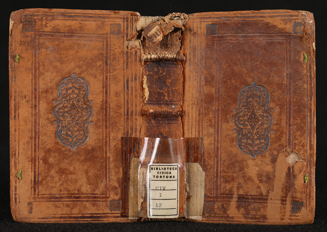 legatura rigida in pelle scamosciata su supporto in cartone, decorata ai piatti a secco con cornice esterna di fascio di filetto; cornice dello specchio con triplice filetto, ferro quadrato a motivo vegetale accantonato esterno; al centro dello specchio composizione con motivi arabeschi. Dorso a tre nervi rilevati e sottolineati; traccia di tassello di carta con titolo manoscritto in prima casella. Tagli verdi. Unghiature decorate con filetto a secco. Note manoscritte sul foglio di guardia superiore. Note di possesso manoscritte sul frontespizio. Tracce di bindelle ai piatti