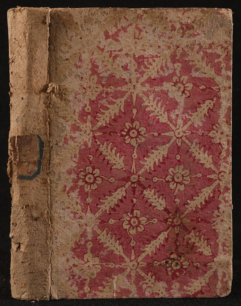 legatura semifloscia in carta su supporto in cartoncino, decorata ai piatti con seminato di corolle in graticcio vegetale con corolle nelle intersezioni. Dorso liscio, traccia di etichetta in carta sul dorso. Tagli grezzi