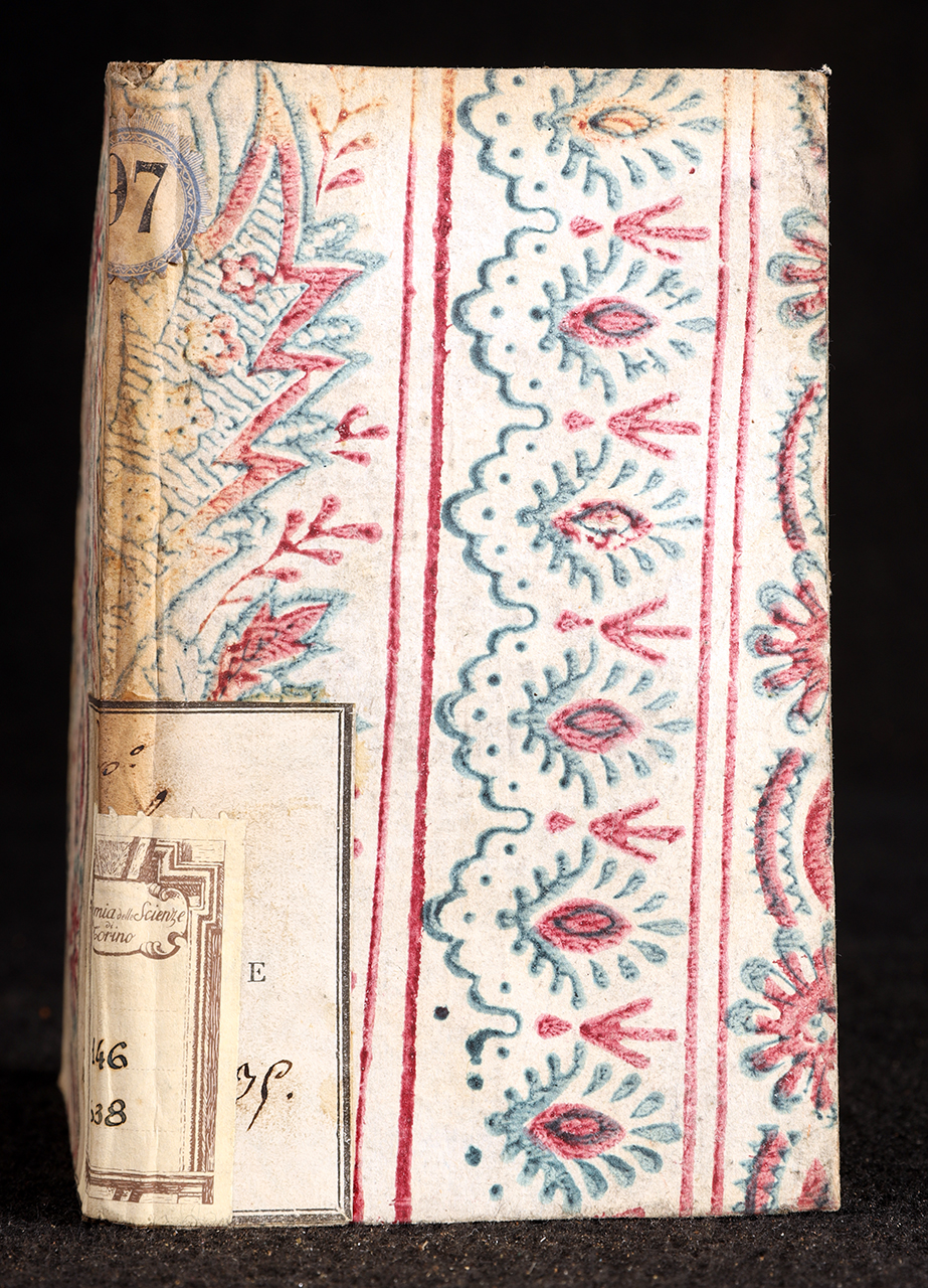Legatura rigida in carta su supporto in cartone decorata ai piatti con motivi vegetali stilizzati ripetuti a tre colori. Dorso liscio. Tagli grezzi