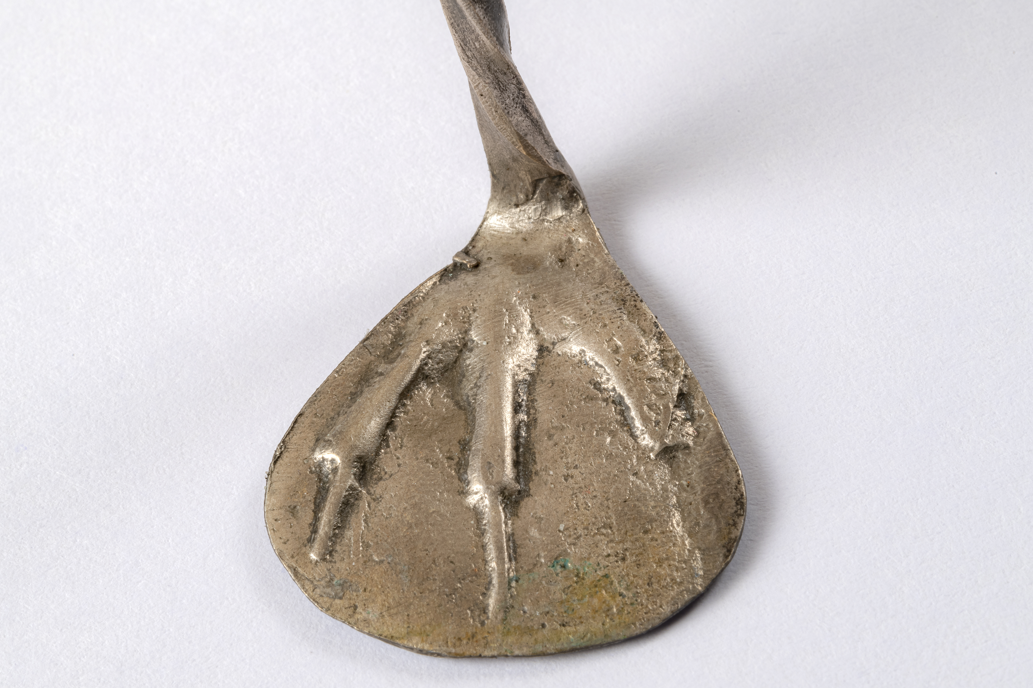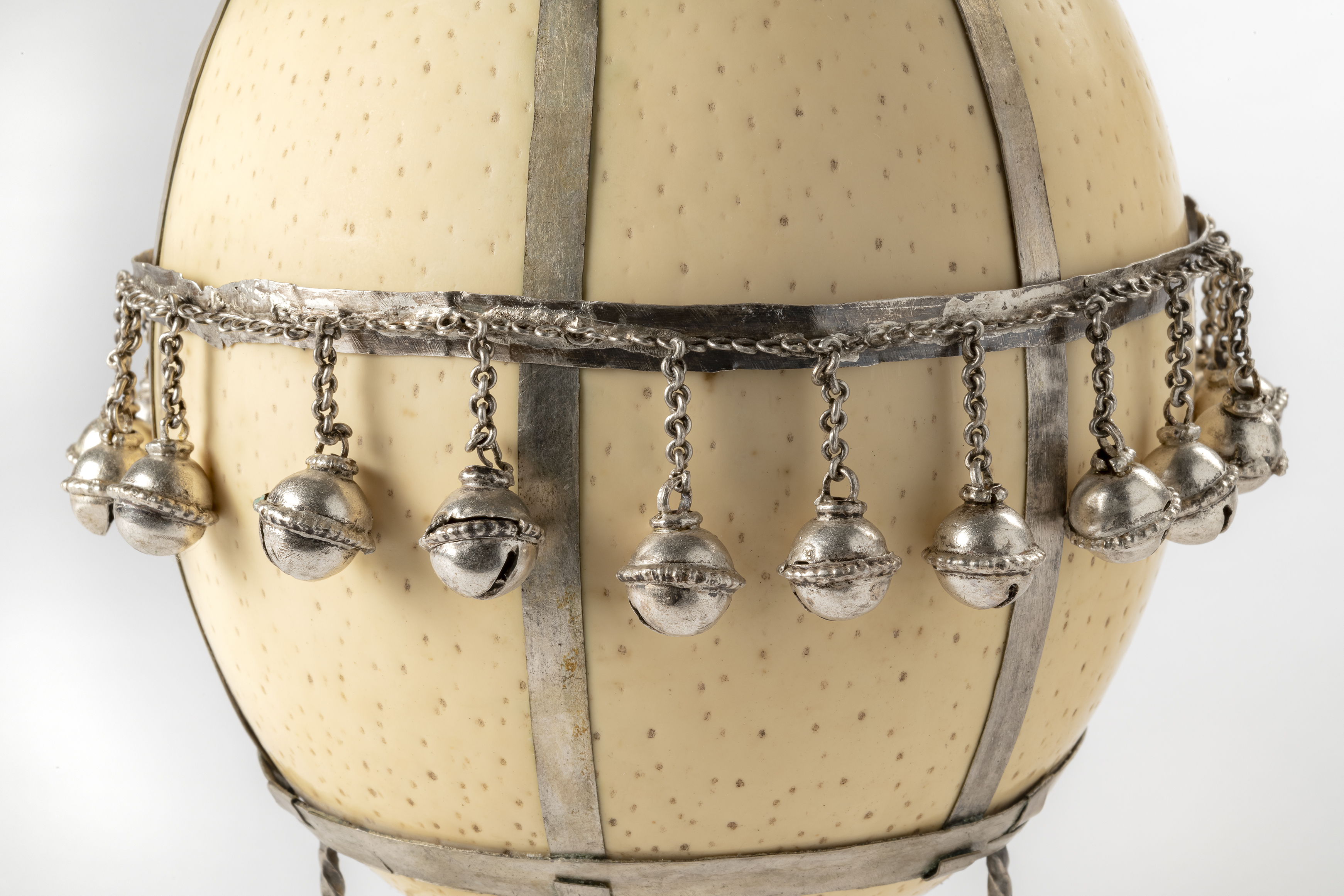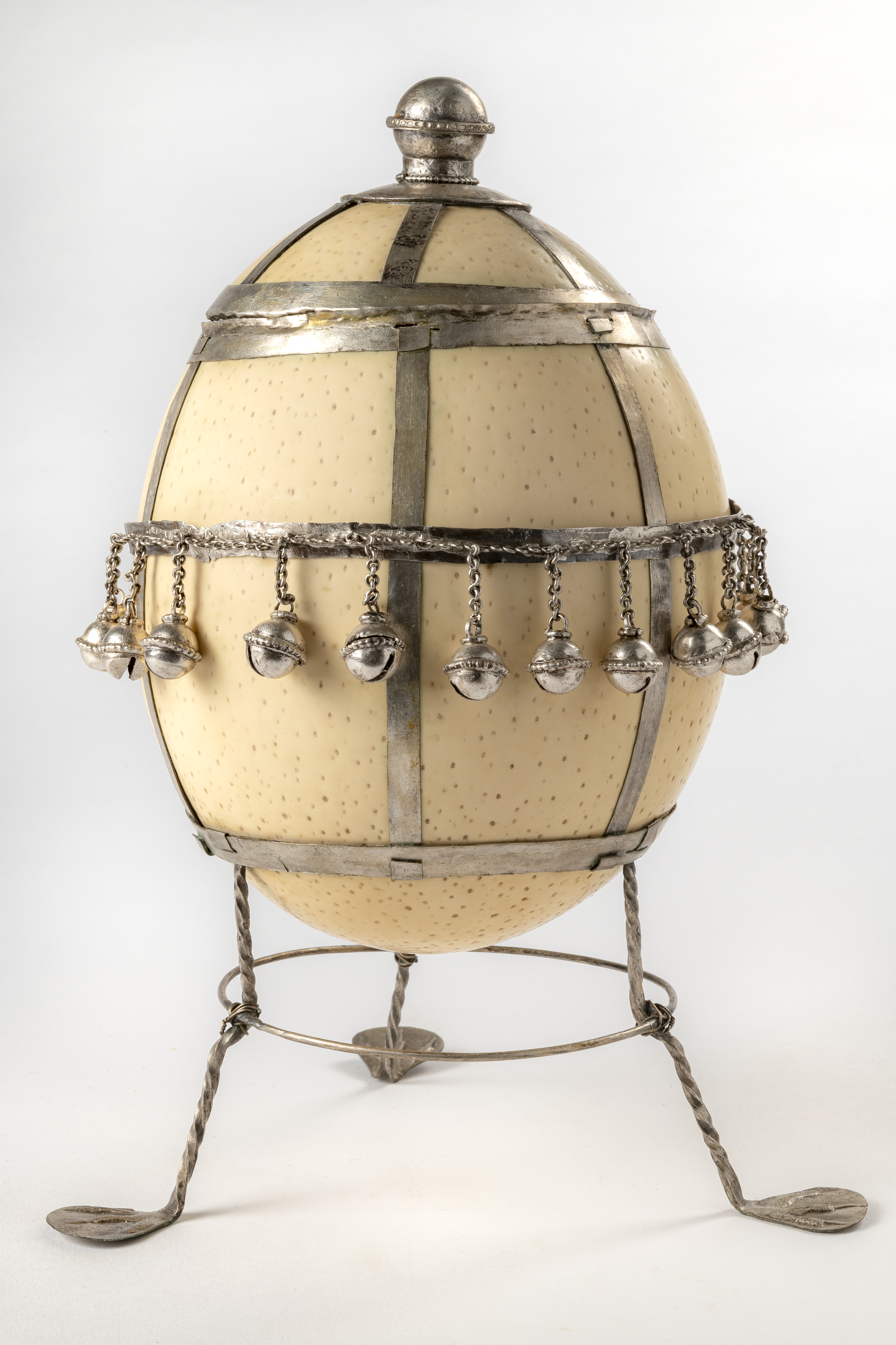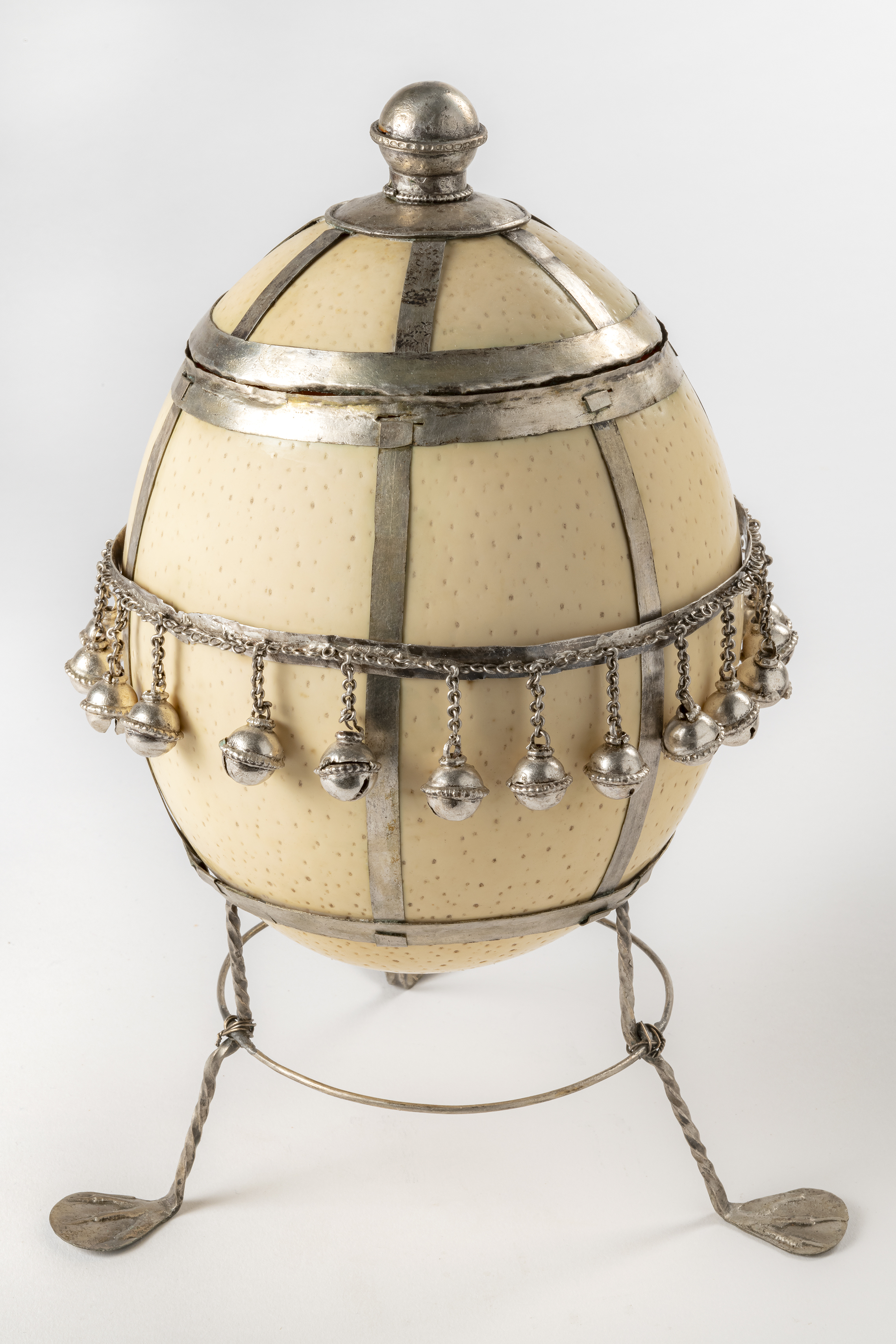 Contenitore realizzato tagliando la parte superiore di un uovo di struzzo svuotato del suo contenuto. Posto entro una struttura di metallo che funge da base con tre piedini decorati a ricordare delle zampe di uccello. I bordi dell'uovo sono rafforzatI da bande di metallo e sulla sommità è presente un pomello che permette di sollevare il coperchio. Al centro, lungo tutta la circonferenza è presente un banda metallica con delle campanelle appese
