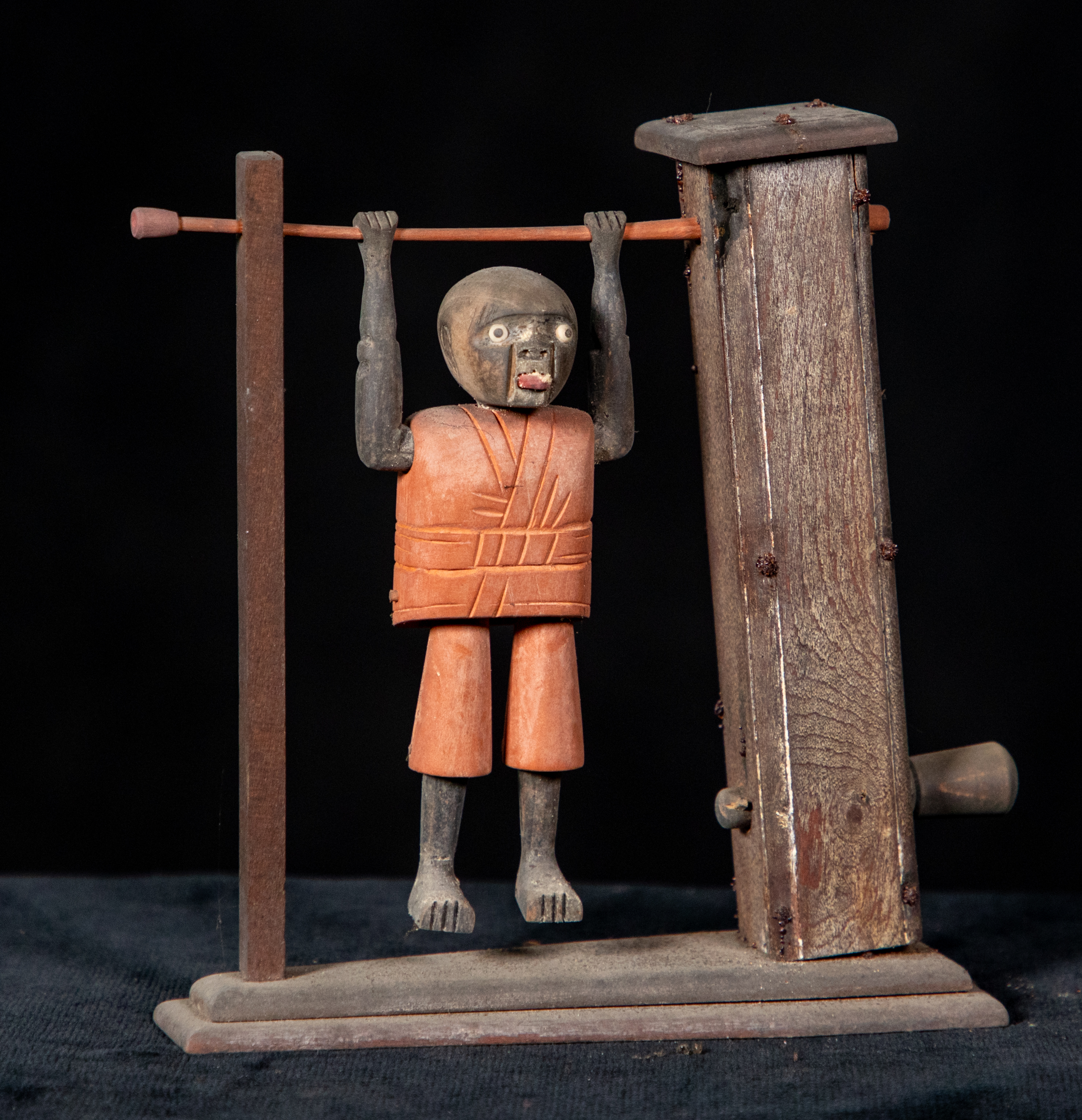 Pilastro dotato di leva che dovrebbe azionare, tramite corde interne, il movimento della figura appesa con entrambe le mani a una sbarra orizzontale. Il personaggio, un essere mutaforma (obakemono) o un fantasma (yūrei), indossa un kimono corto e un paio di pantaloni al ginocchio