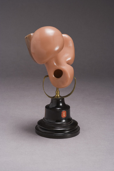Rappresentazione ingrandita di uno stadio di sviluppo del cuore dell'embrione umano. Modello in cera rossiccia, sorretto da un supporto metallico a sua volta infilato in una base lignea dipinta di nero