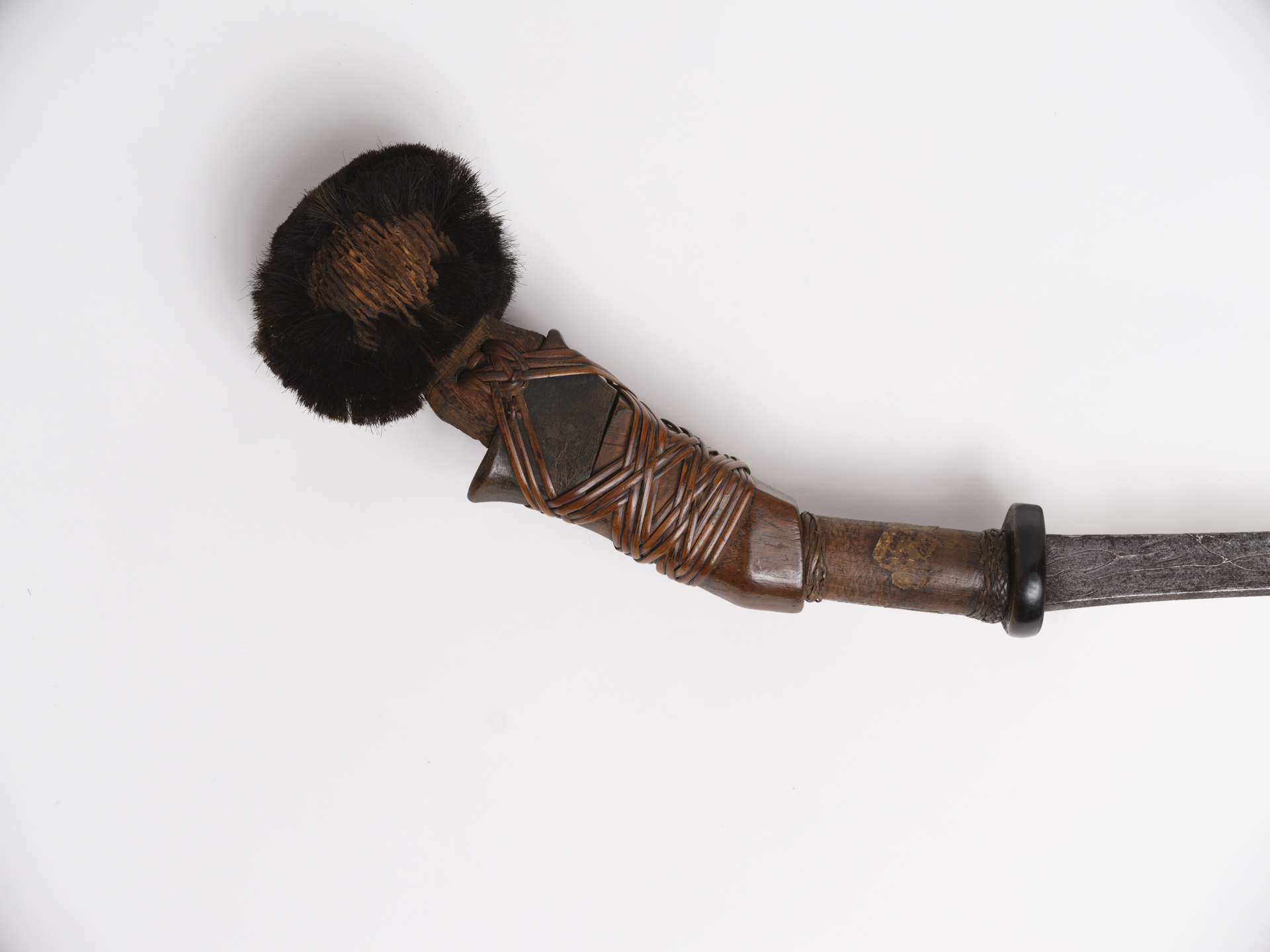 Impugnatura in legno di giunco con pomo sferico con crine di cavallo o capelli. Un piccolo dischetto ligneo assolve al ruolo di elsa. La lama, curva in un grezzo acciaio damasco terminante tronca, è caratterizzata da una decorazione centrale ottenuta tramite il ripiegamento delle lamine d’acciaio che la costituiscono, alternando acciaio dolce a quello ad alto tenore di carbonio