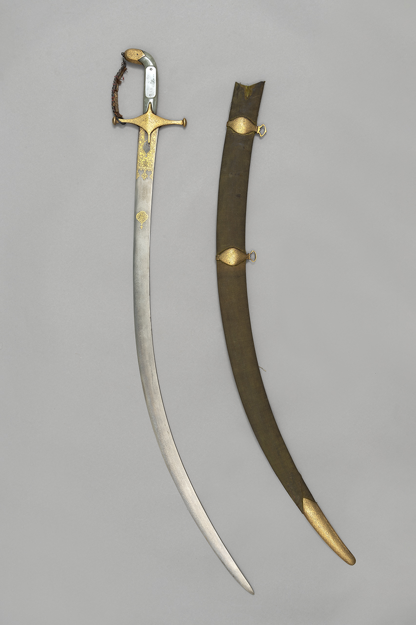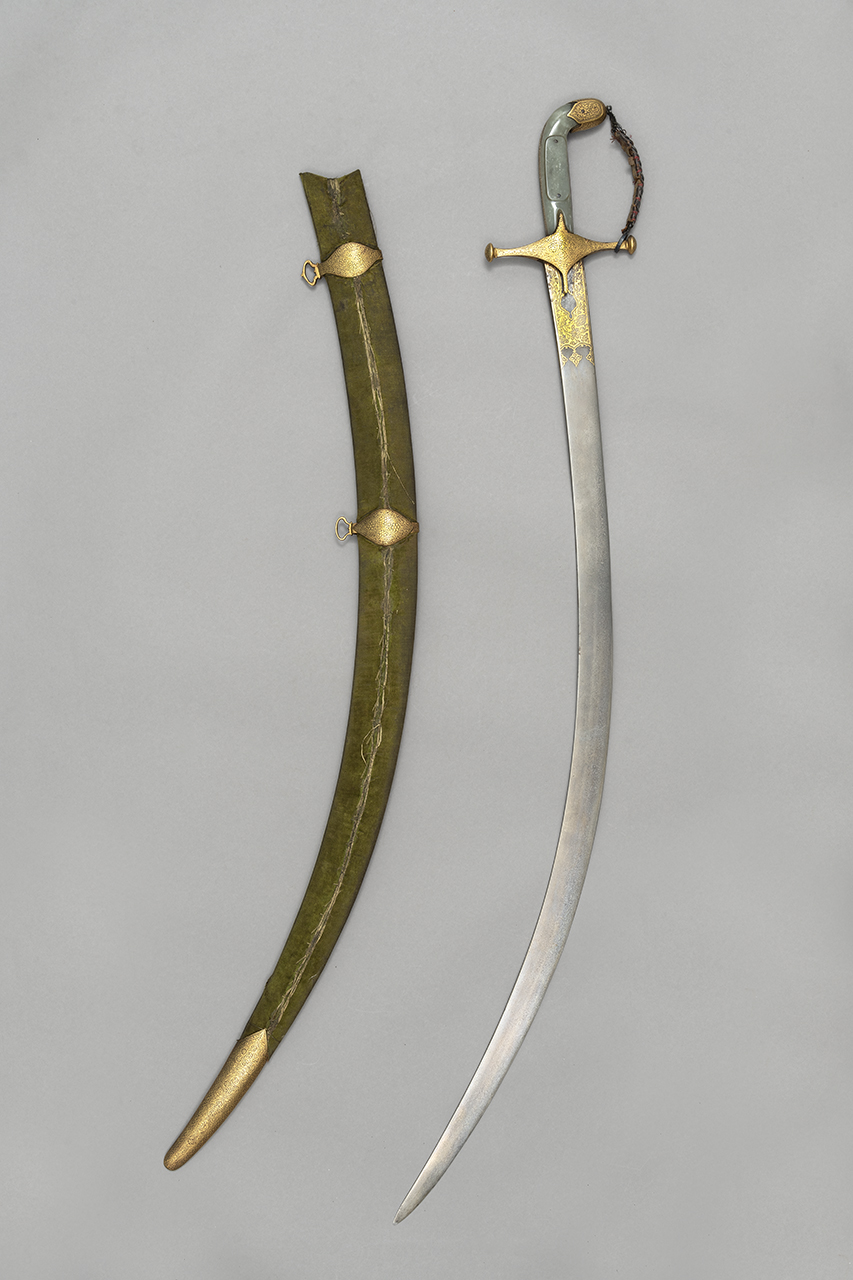 Pomo in acciaio dorato con motivi floreali. Impugnatura composta da due guancette in giada fissate al codolo mediante rivettatura; nelle parti centrali continua la medesima decorazione del pomo su due piastrine in acciaio. Fornimento in acciaio dorato decorato similmente al pomo; bracci dritti terminanti con due piccoli bottoni; il pomo e il braccio di guardia sono collegati mediante una serie di anelli fissati tra loro e su di un supporto in cuoio. Lama in acciaio damasco curva con punta triangolare riccamente decorata con motivi floreali dorati alla tausìa; sulla lama è inoltre presente una iscrizione con caratteri turco-ottomani sempre dorata alla tausìa. Fodero in pelle ricoperta da velluto nero; fascette e puntale in acciaio decorati come il fornimento