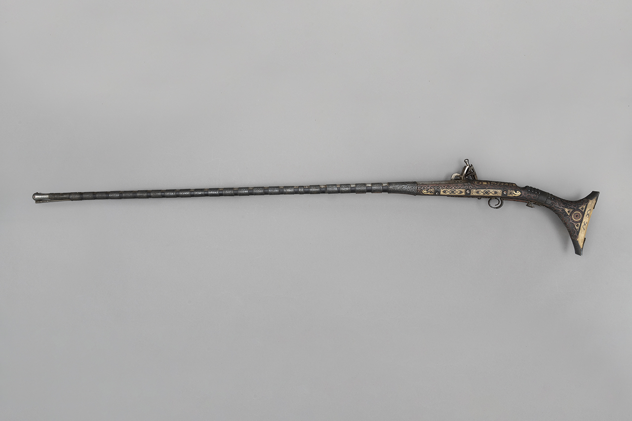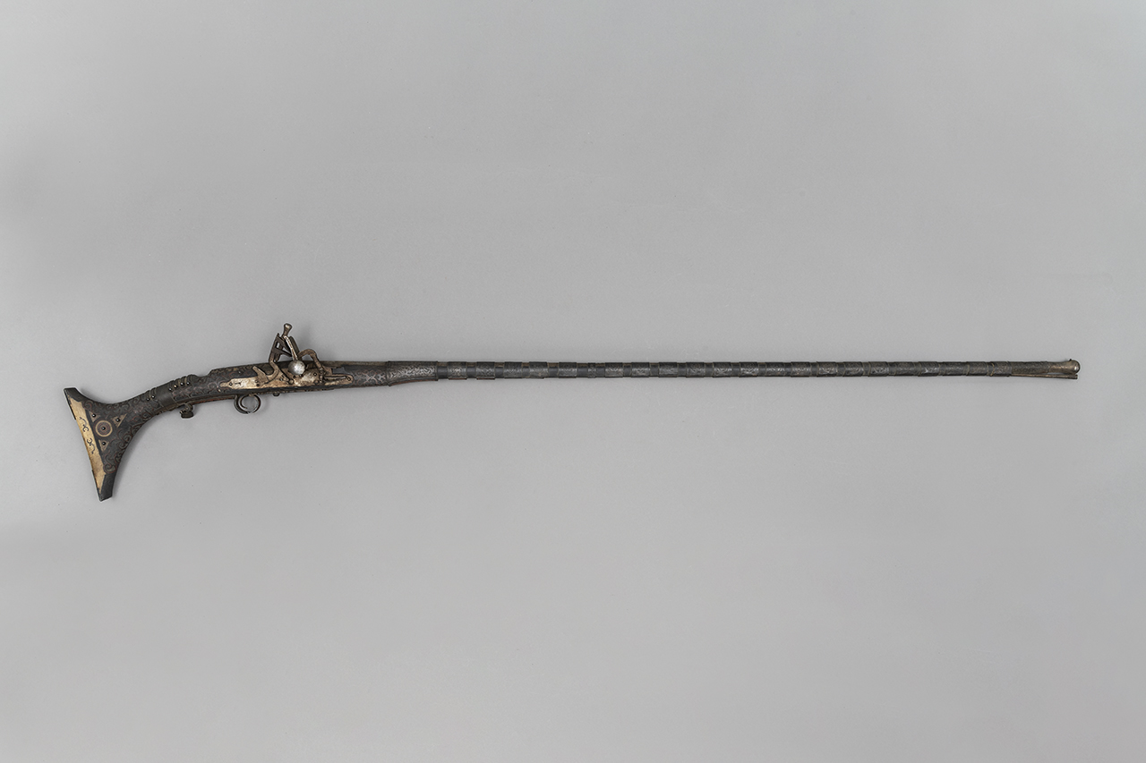 Canna in acciaio a due ordini, quadra e tonda, con capitello a mezzo balaustro. Piastra in acciaio liscia con focile Snaphance. Cassa in legno decorata con tralci carnosi in argento impreziositi in posizione centrale con lacca rossa. Il calcio termina in avorio con tarsie in ebano e argento. Fornimenti in acciaio