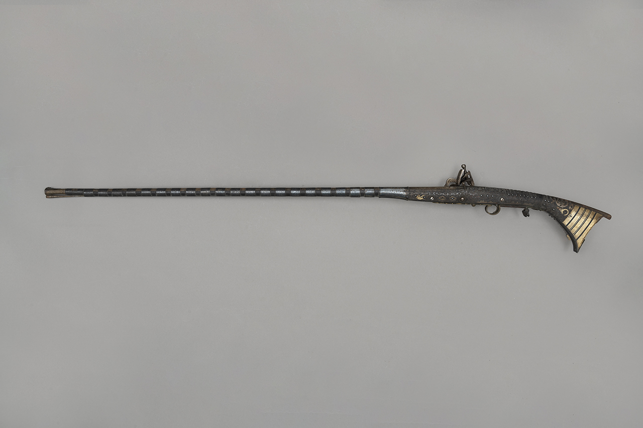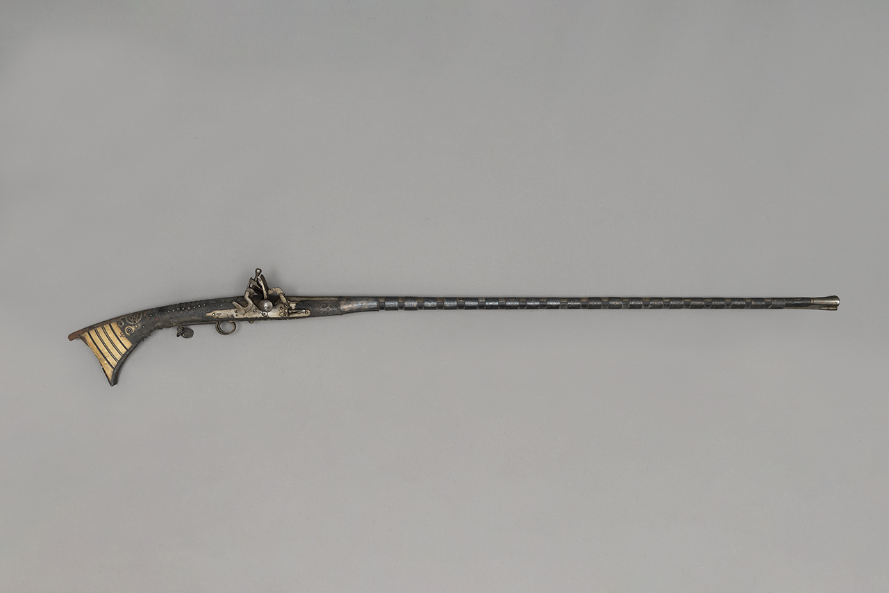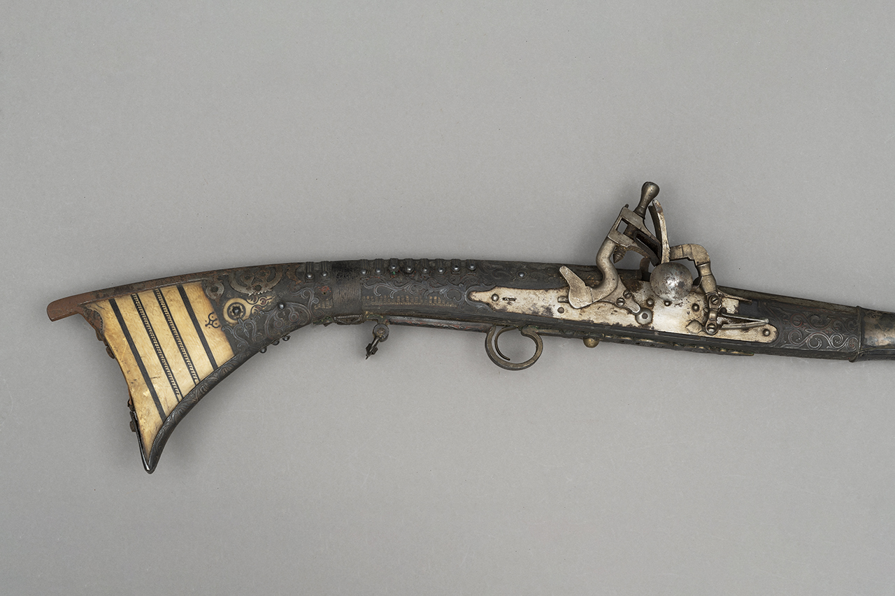 Canna in acciaio a due ordini, quadra e tonda, con testa a mezzo balaustro. Piastra in acciaio liscia con focile Snaphance. Cassa in legno decorata con tralci carnosi in argento impreziositi in posizione centrale prevalentemente con lacca nera ma anche rossa. Il calcio termina in avorio scandito da tarsie parallele in ebano. Fornimenti in acciaio