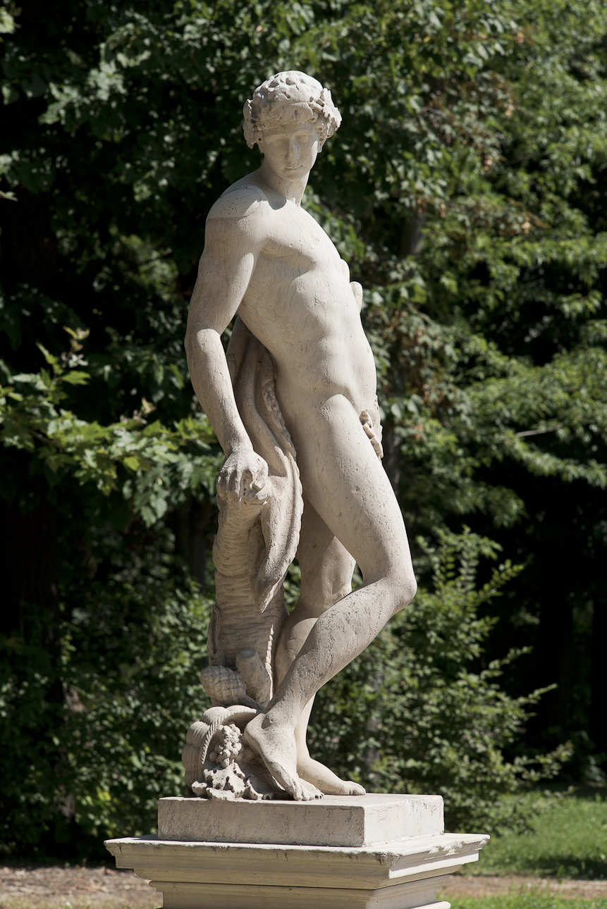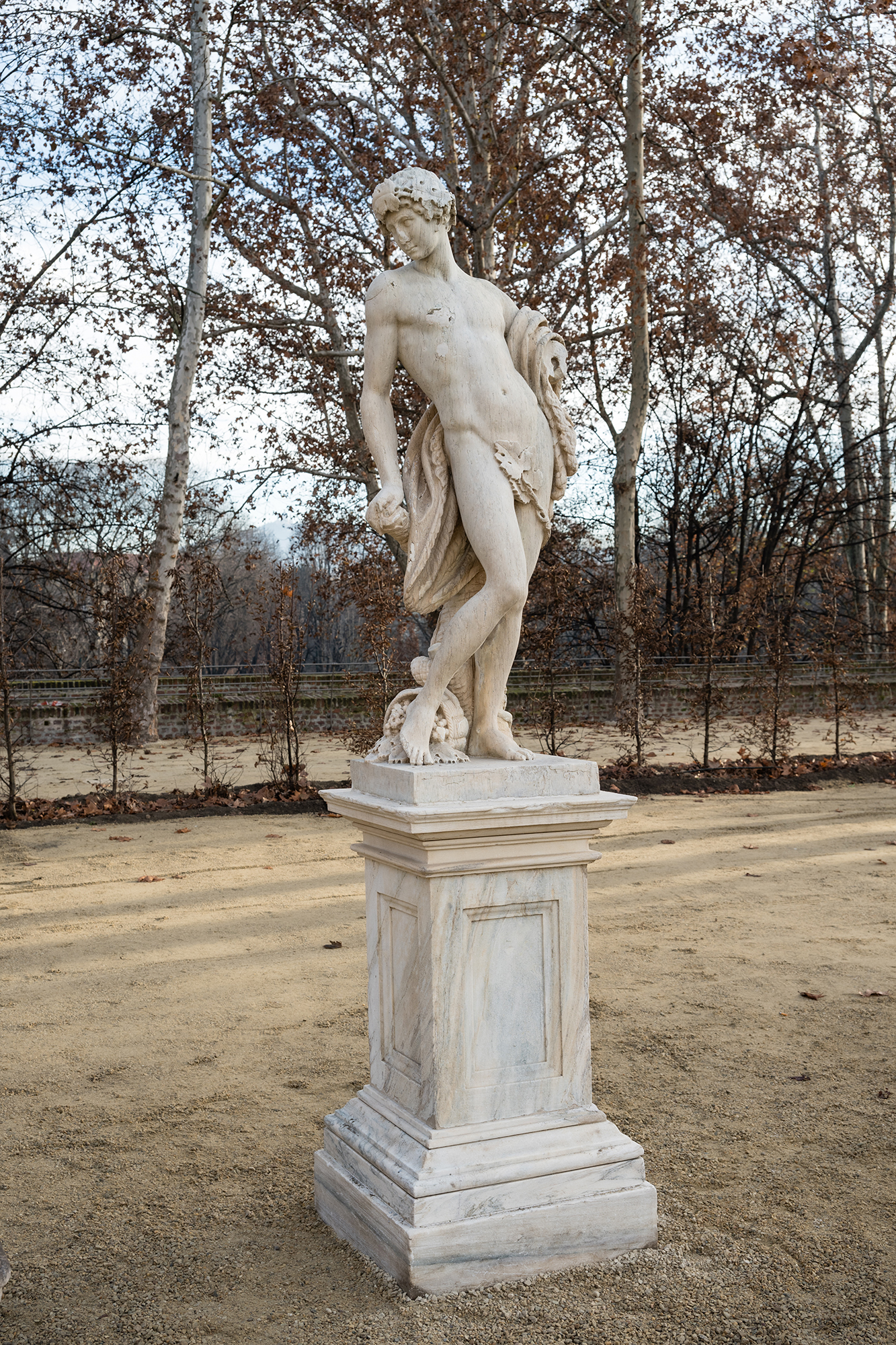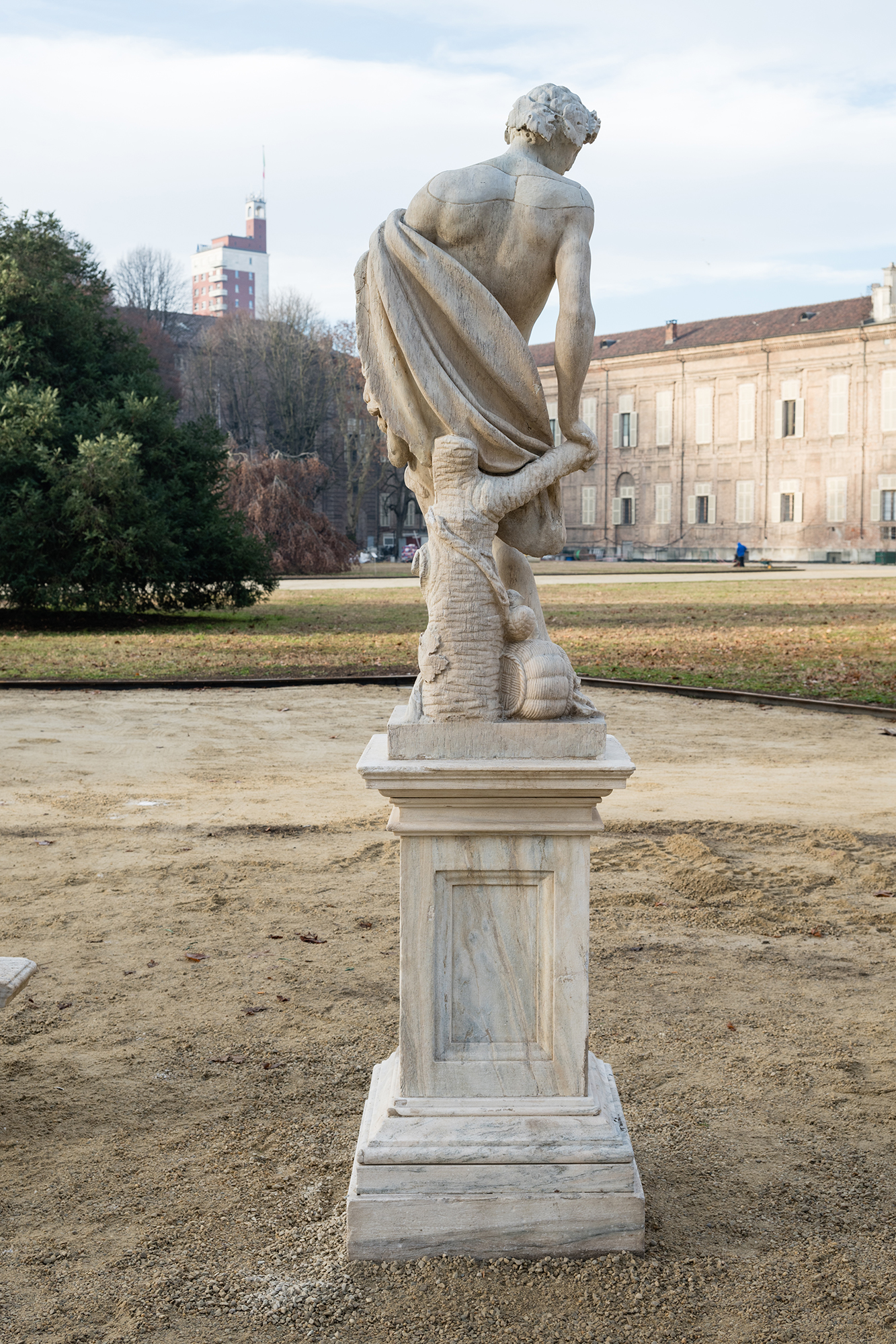 - NOTIZIE STORICO CRITICHE la statua si trova nel Giardino di Levante dei Giardini Reali di Torino e fa parte degli elementi scultorei che adornano il Grand Rondeau al centro della composizione architettonica con la fontana della Nereide e dei Tritoni realizzata tra il 1755 ed il 1757 dallo scultore messinese Simone Martinez, nipote dell’architetto Filippo Juvarra. L’opera è una delle 16 statue su piedistallo a figura umana, alle quali si alternano n. 14 vasi a coppa e n. 2 vasi ad anfora, anch’essi su basamento, e panche (n. 31). In particolare, le statue sono collocate ad esedra attorno al gruppo scultoreo del Martinez, eccetto la prima sul filare di sinistra, che mostra una giovane fanciulla con vesti e mazzolino di fiori, mentre la sequenza dei vasi a coppa delimita il percorso che conduce alla fontana (n. 6 vasi sul filare di destra e n. 6 sul filare di sinistra) con i 2 vasi ad anfora e i rimanenti 2 a coppa che definiscono a levante il rondeau. L’allestimento del giardino, come lo si legge attualmente, costituito dalla doppia teoria di vasi marmorei lungo i lati del parterre di levante, con la fontana del Martinez al centro e l’anfiteatro delle statue attorno, è riconducibile ad un’eredità di epoca napoleonica, ma riguardo l’origine e la paternità delle statue si hanno poche notizie. In Rabellino 2019, pag. 28 si legge che le statue poste ad emiciclo attorno alla fontana dei Tritoni sono di epoca seicentesca e, tra le 16 opere, 8 figure in posizione eretta derivano dallo smantellamento della fontana del Rondeau del Giardino di Sua Altezza costruita nel 1663. Secondo le fonti bibliografiche l’opera, assieme ad un’altra scultura rappresentante un uomo anziano, è attribuita al ticinese Bernardino Quadri: “Le due statue qui riprodotte, un Vecchio e il Bacchino, fra le migliori nel complesso di queste figure mediocri (alcune anzi poverissime) si possono dubitativamente assegnare al Quadri; vi risalta un manierismo molto arcaico, neocinquecentesco” (cit. Mallè 1963, pag. 33), ma la paternità non è mai confermata. E’ probabile che altre siano di provenienza dai magazzini delle fabbriche ducali e che all’epoca siano state restaurate per essere utilizzate nei giardini. Occorre comunque fare riferimento all’intera vicenda che riguarda la realizzazione del Giardino di Levante per il quale si veda la documentazione storica allegata (continua in documentazione storica)