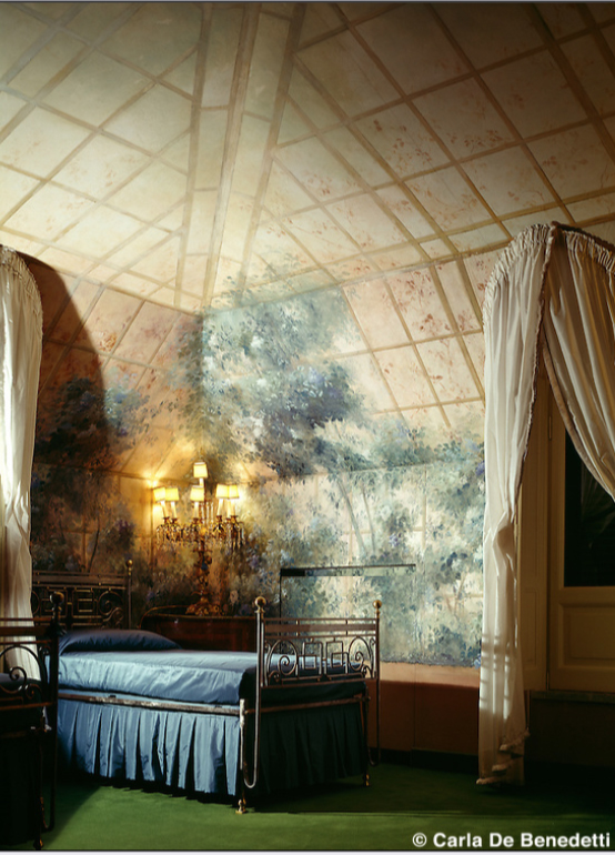 Serie di coppie di tende, in raso di cotone bordato color panna; la struttura portante curva segue la linea architettonica delle porte finestre delle stanze del piano primo