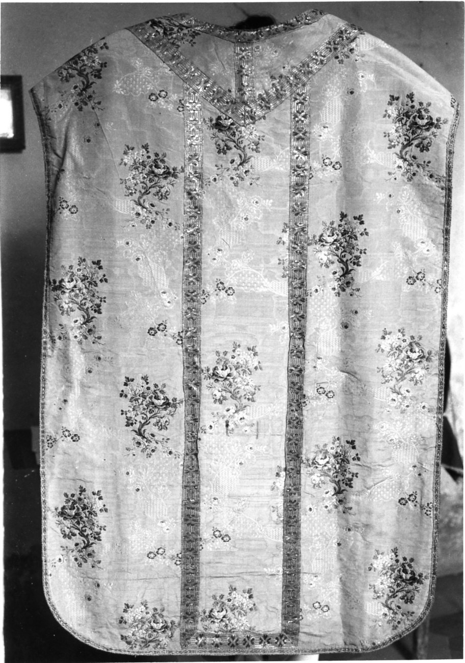 Paramento liturgico in seta rossa broccata, composto da pianeta, velo da calice, borsa, manipolo e stola