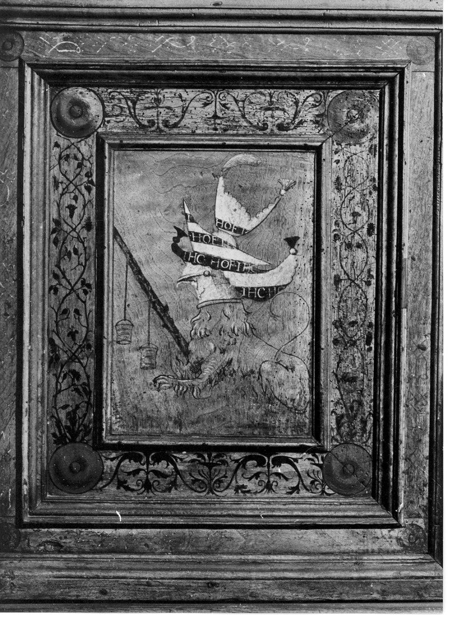 Uno degli sportelli dell'armadio inferiorein legno intarsiato in parte dipinto con raffigurazione di leone con elmo, impresa della famiglia Sforza