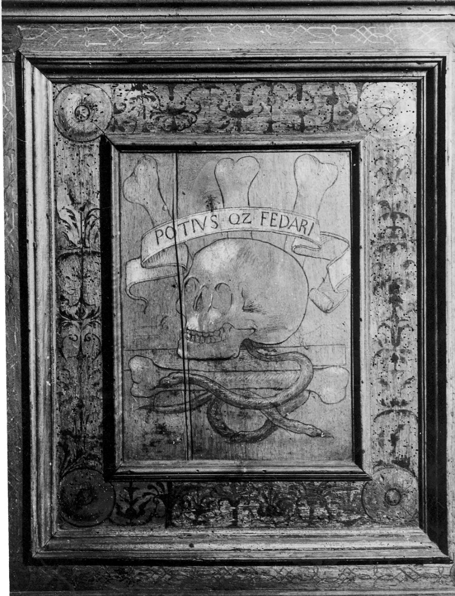 Uno degli sportelli dell'armadio inferiorein legno intarsiato in parte dipinto con raffigurazione di teschio con ossa e serpente