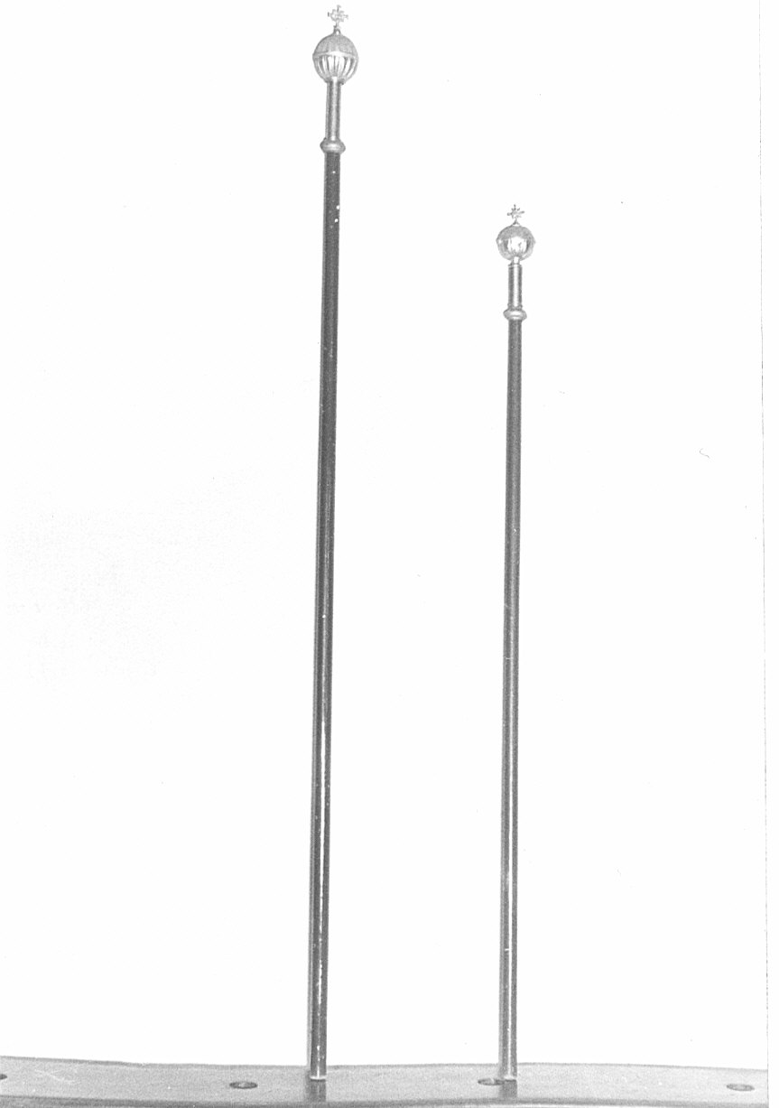 - NOTIZIE STORICO CRITICHE Oggetti comuni per processione, di stile e fattura novecentesca. La mazza di altezza maggiore era portata dagli uomini, quella di altezza inferiore dai bambini. Da ricondurre probabilmente al tempo di costruzione della chiesa (1914-1916)