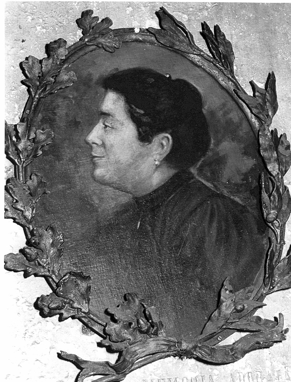 Dipinto raffigurante Adelaide Cagnoni De Benedetti ritratta a mezzo busto con capelli neri in veste bruno scuro. Il dipinto è protetto da vetro e racchiuso in una cornice in bronzo decorata a ramoscelli di quercia e lauro