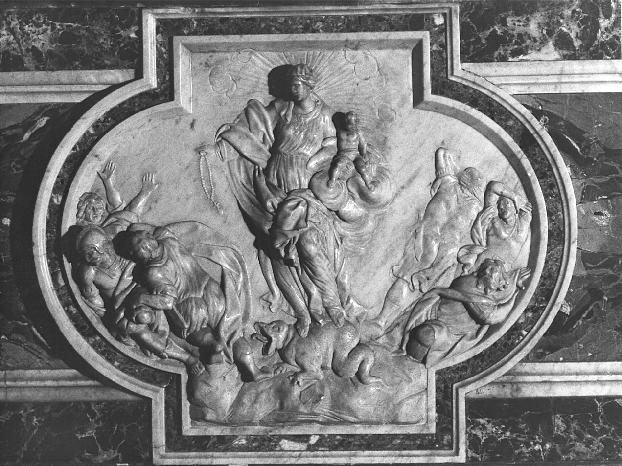 Al centro del paliotto vi è un medaglione con rilievo raffigurante la Madonna con Bambino che sconfigge due gruppi di armati (allegoria dell'eresia)