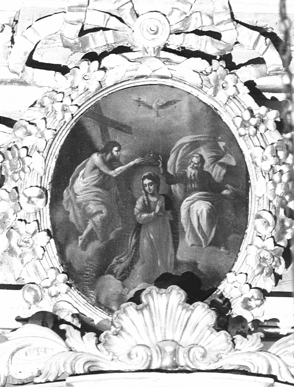 Personaggi: Cristo; Maria Vergine; Eterno Padre. Fenomeni metereologici: nuvole. Fenomeni naturali: luce. Oggetti: corona. Simboli: (Spirito Santo) colomba
