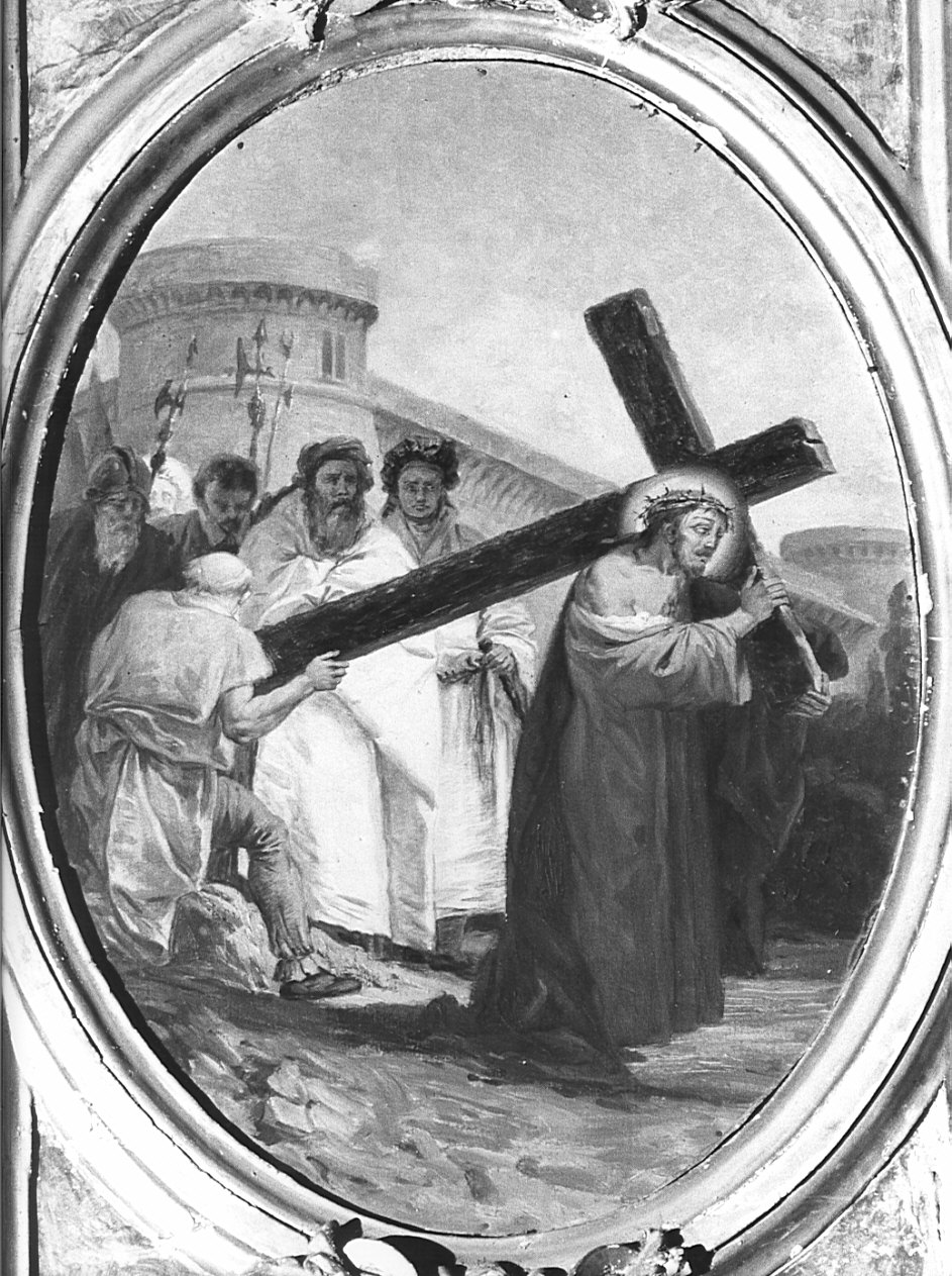 Personaggi: Cristo; Simone il Cireneo. Figure maschili: uomini; soldati. Oggetti: croce. Armi: lance. Vedute: Gerusalemme: mura