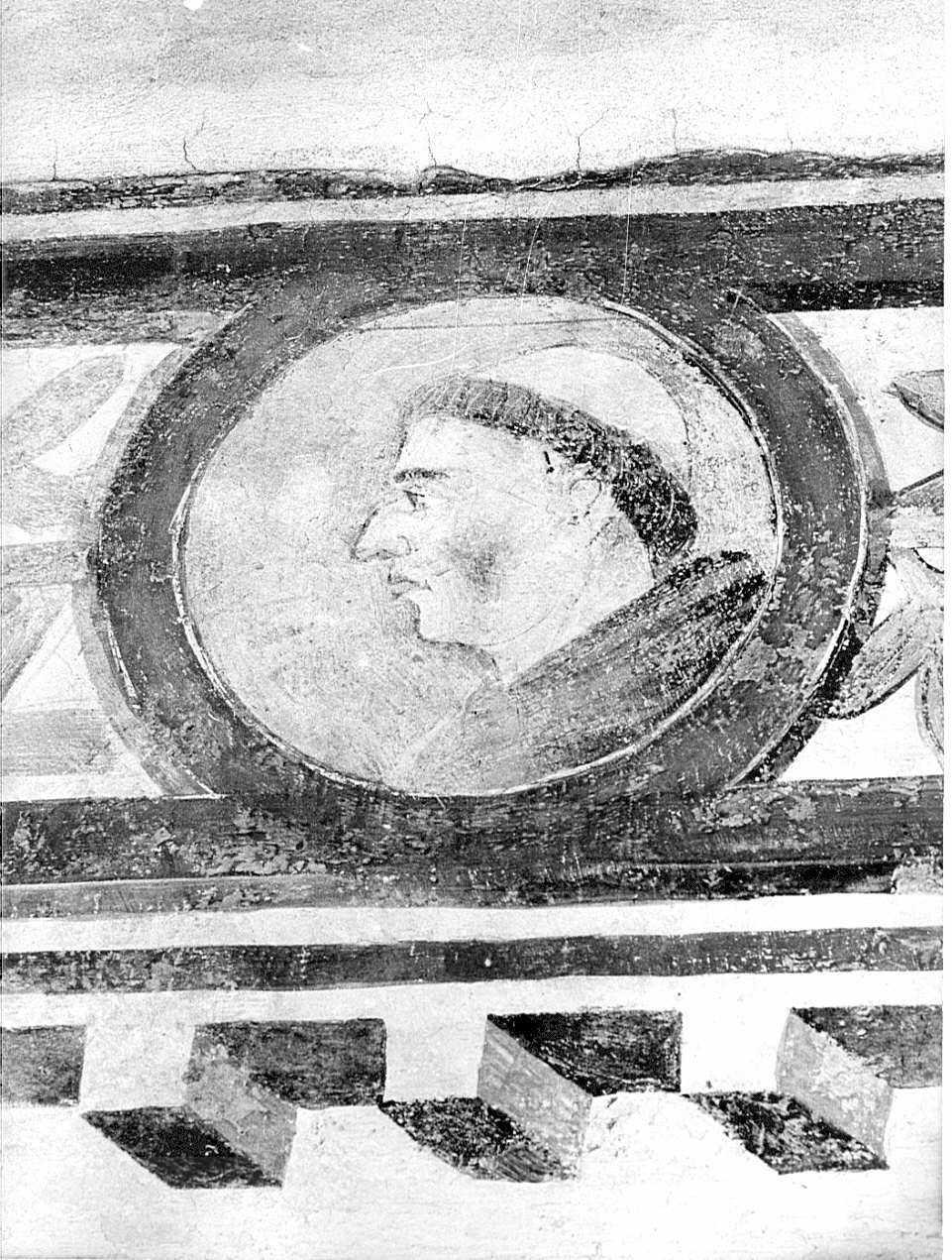 Affresco con tondo rosso su sfondo verde raffigurante profilo di monaco