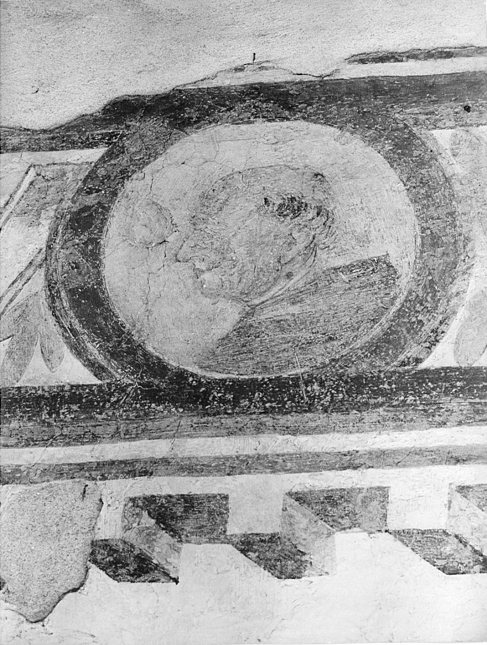 Affresco con tondo rosso su sfondo verde raffigurante profilo di monaco