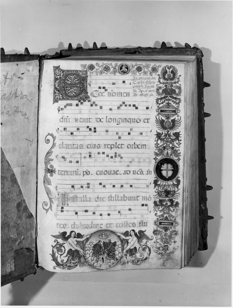Il corale ms. membranaceo di cc. 248 numerate solo in parte verso la fine, è scritto in nero su sei righi musicali per pagina. Lettere dei capoversi in rosso e nero o blu e rosso. Date delle ricorrenze delle antifone in rosso. C.lr lettera E miniata in azzurro, rosso e verde. In alto alla pagina tondo con San Bassiano su fondo nero tra motivo ornamentale con foglie verdi e fiori rosso blu. Sul lato lungo stemma della città di Lodi inquadrato da motivo ornamentale a delfini, mascheroni e cartigli. In basso, tondo con scena dell'Incoronazione di Maria a colori blu e rosso affiancata da angeli.(C.lr: il medaglione con lo stemma di Lodi è stato rifatto nel XIX secolo in luogo dell'originale tagliato. Mancano le ultime pagine)