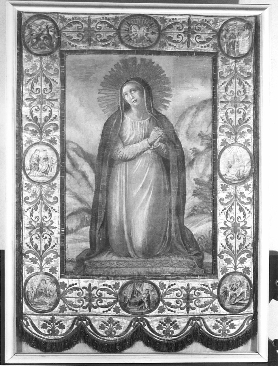 Stendardo di raso di seta bianco avorio alternato a fasce, aggiunte, di seta verde acqua, ricamato "a riporto" in filo dorato ossidato. Recto: bordo con decorazioni a candelabra alternate con otto ovali dipinti a tempera raffiguranti alcuni misteri del Rosario: Gesù Crocifisso; Deposizione; Prsentazione al Tempio, Natività; Visitazione; Gesù caricato dalla croce. Al centro: la Vergine addolorata inginocchiata, con tunica bianca e manto azzurro. Testa raggiata con fili dorati. Un paesaggio come sfondo. Verso: fondo bianco-avorio ricamato "a riporto" con decorazioni a candelabra in filo dorato. Tondi centrali con pellicano ed ancora. Al centro tra nuvole due putti e trionfo di cherubini in adorazione del S. Sacramento. Teste, mani, scene dipinti a tempera, Canutiglia dorata