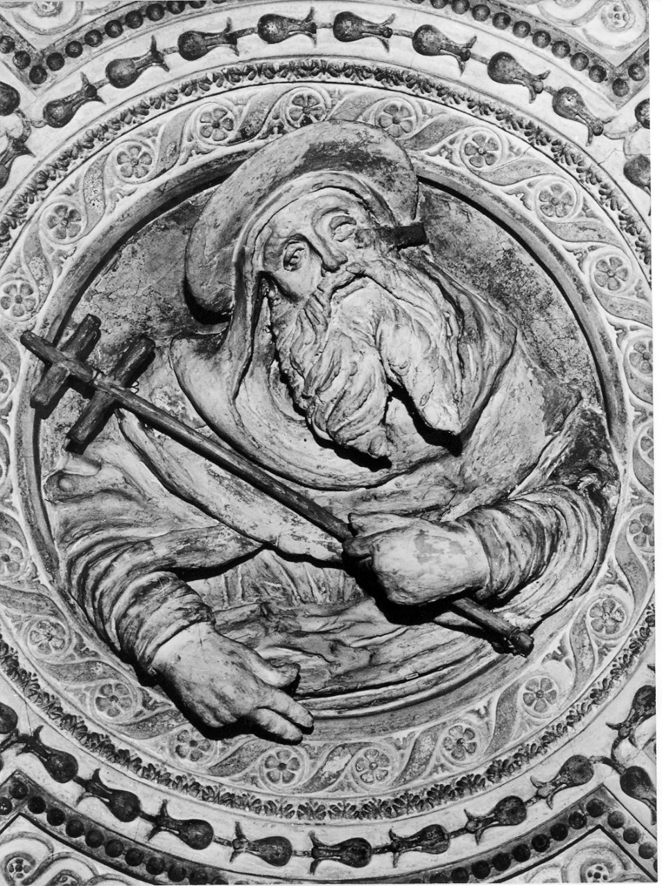 S. Girolamo in vesti cardinalizie, con lunga barba, regge con la sinistra una croce a doppia traversa. Tracce di colore rosso sulla veste e sulla tesa del copricapo. Un ferro infisso nella muratura tiene la testa del santo ben salda alla volta