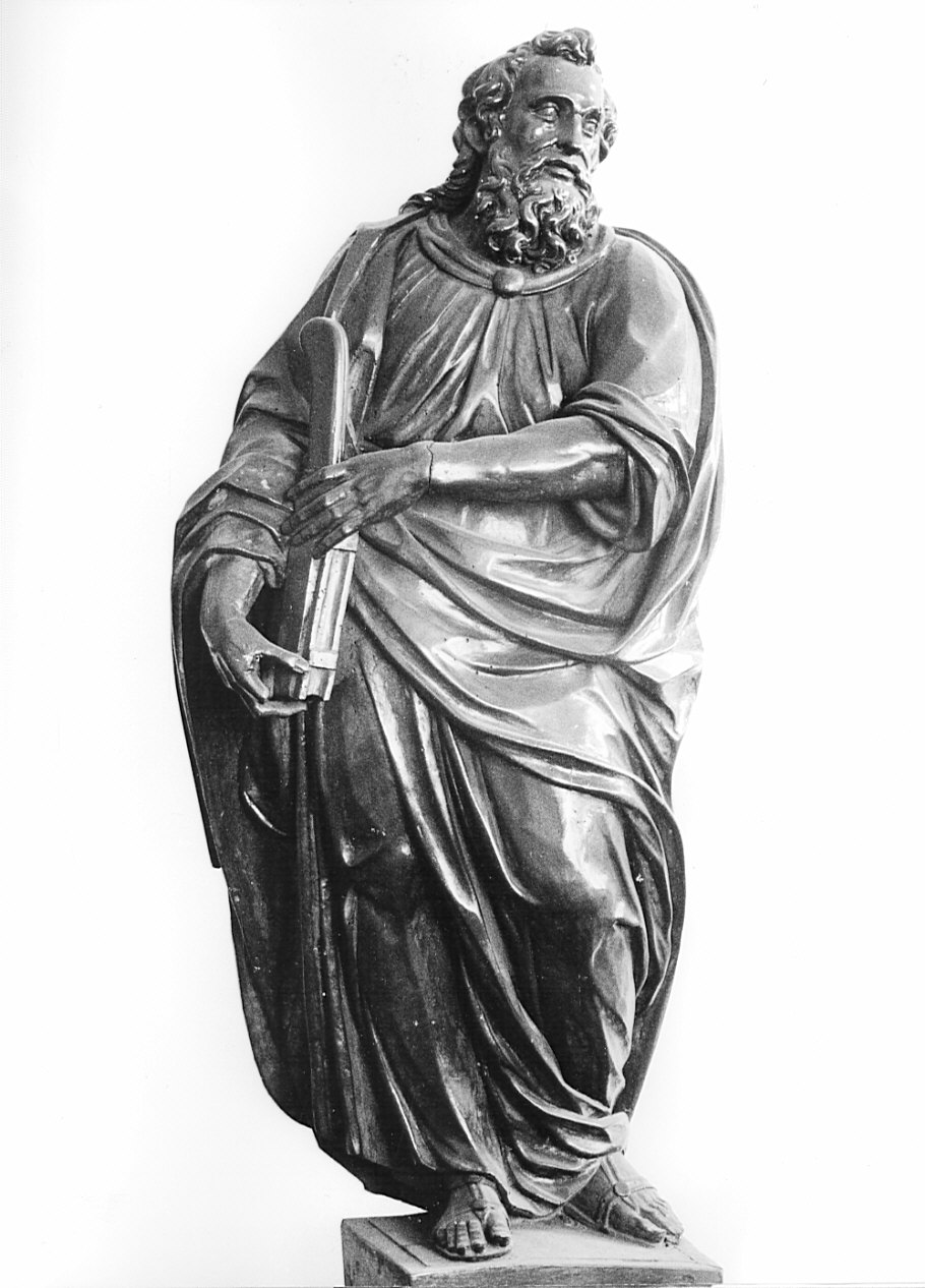 L'apostolo, forse S.Bartolomeo, se è un coltello l'arnese che tiene con le due mani, appoggiato al fianco destro, è effigiato avvolto in un ampio manto, con barba e capelli lunghi. La statua è collocata, assieme alIe altre degli apostoli, come coronamento degli armadi