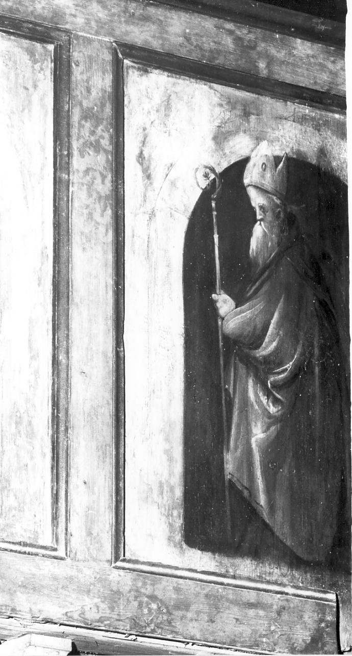 Il Santo vescovo è forse identificabile in San Giovanni Grisostomo, del quale nella chiesa esiste un'importante reliquia. La tavola è collocata nel secondo scomparto da sinistra del lato della balaustra orientato verso l'ingresso