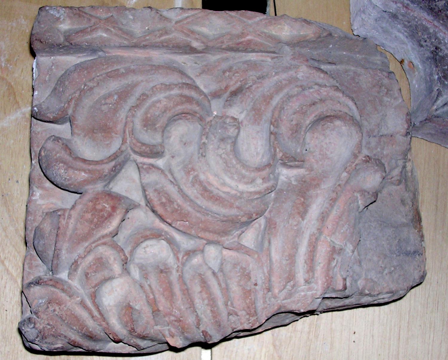 Il frammento comprende largo cespo di foglie dalle forme sinuose e accartocciate con lunghe venature profondamente incise. Su di un lato corre una cornice a losanghe incavate, suddivise da filettature