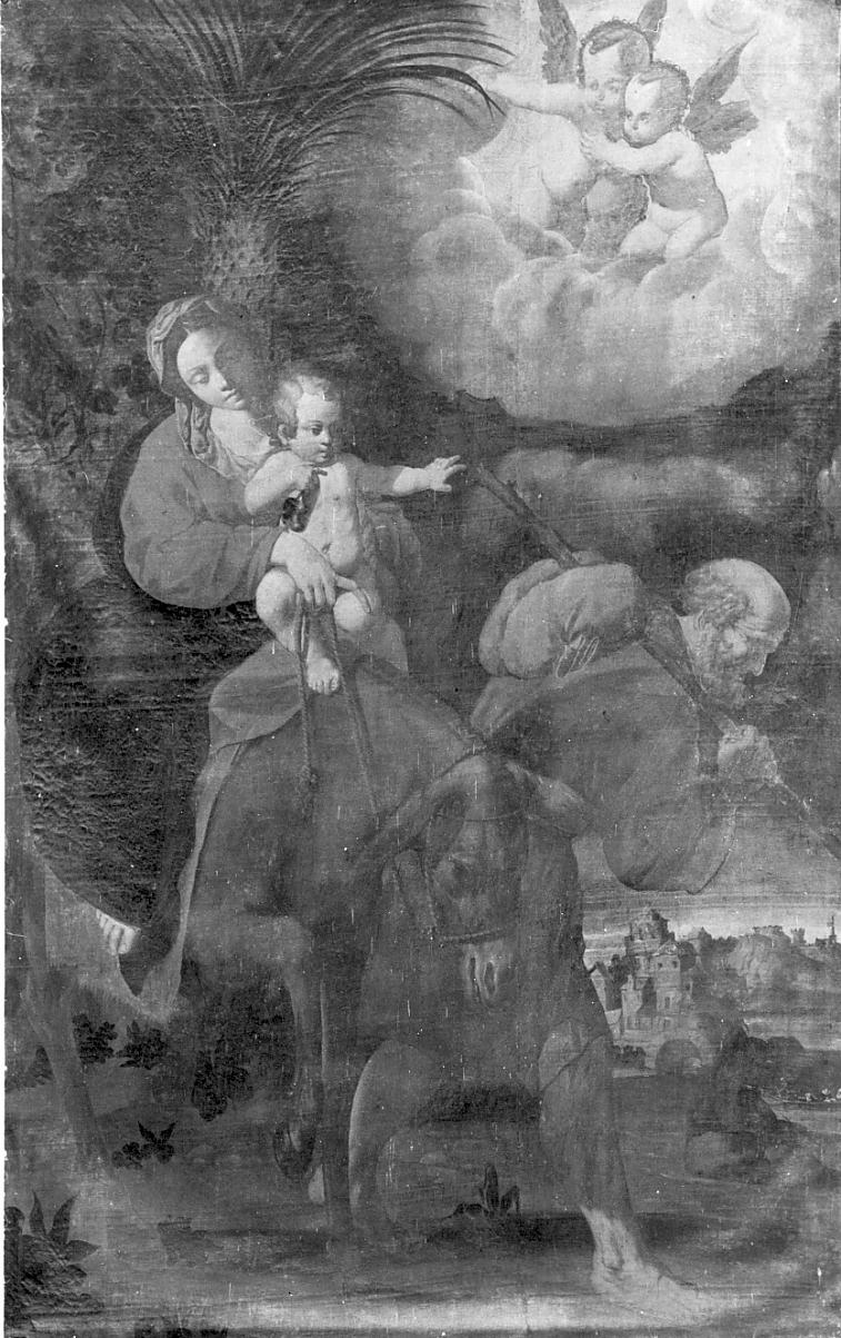 La Madonna e il Bambino sull'asino sono preceduti da San Giuseppe a piedi con un fardello sulla schiena; in alto tra le nubi tre angioletti. Paesaggio di torri e mura merlate sul fondo con una palma come quinta a sinistra