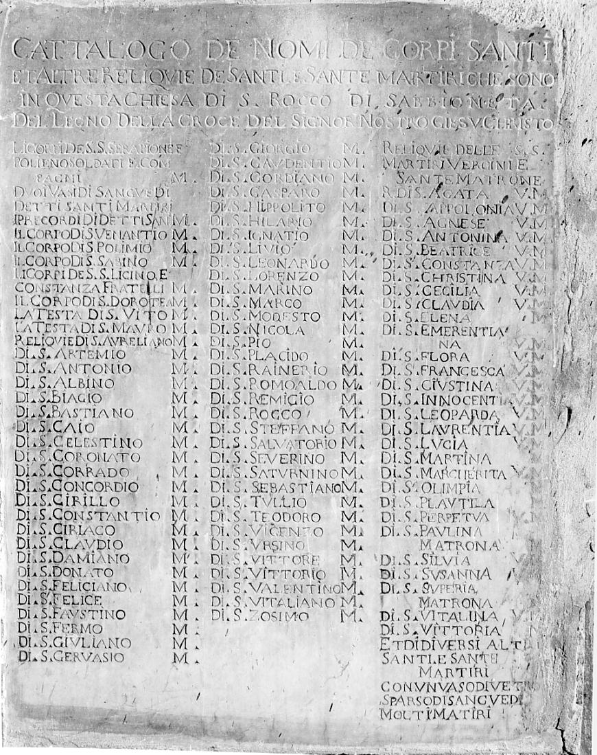 - ISCRIZIONI CATTALOGO DE NOMI DE CORPI SANTI/ ET ALTRE RELIQUIE DE SANTI E SANTE MARTIRI CHE SONO/ IN QUESTA CHIESA DI S.ROCCO DI SABBIONETA/ DEL LEGNO DELLA CROCE DEL SIGNOR NOSTRO GIESU CHRISTO/ LI CORPI DE S. SEBAPIONE E/ POLIENO SOLDATI E COMPAGNI M./ DUOI VASI DI SANGUE DI/ DETTI SANTI MARTIRI/ I PRECORDI DI DETTI SAN. M./ ILORPO DI S. POLIMIO M./ IL CORPO DI S. SABINO M./ IL CORPO DI S. VENANTIO M./ LI CORPI DE S. LICINO E/ CONSTANZA FRATELLI M./ IL CORPO DI S. DOROTEA M./ LA TESTA DI S. VITO M./ LA TESTA DI S. MAURO M./ RELIQUIE DI S. AURELIANO M./ DI S. ARTEMIO M./ DI S. ANTONIO M./ DI S. ALBINO M./ DI S. BIAGIO M./ DI S. BASTIOANO M./ DI S. CAIO M./ DI S. CELESTINO M. /_ DI S. CORONATO M./ DI S. CORRADO M./ DI S. CONCORDIO M./ DI S. CIRILLO M./ DI S. CONSTANTIO M./ DI S. CIRIACO M./ DI S. CLAUDIO M./ DI S. DAMIANO M./ DI S. DONATO M./ DI S. FELICIANO M./ DI S. FELICE M./ DI S. FAUSTINO M./ DI S. FERMO M./ DI S. GIULIANO M./ DI S. GERVASIO M./ DI S. GIORGIO M./ DI S. GAUDENTIO M./ DI S. C - lettere capitali - a incisione -