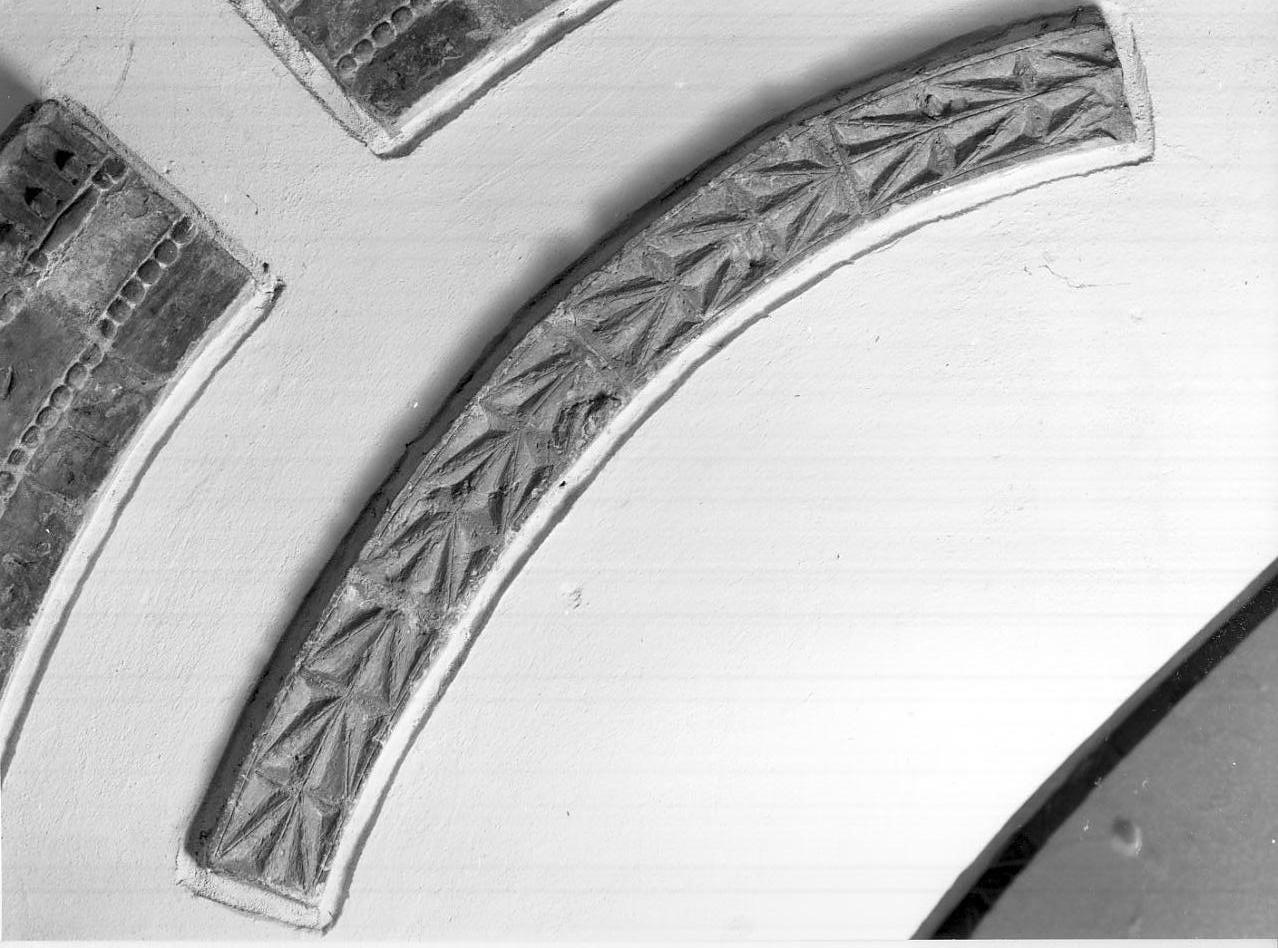 Quattro mattonelle per ghiera d'arco aventi ciascuna intagliati, entro tre riquadri, triangoli isosceli con scanalature nel rilievo centrale e nei lati