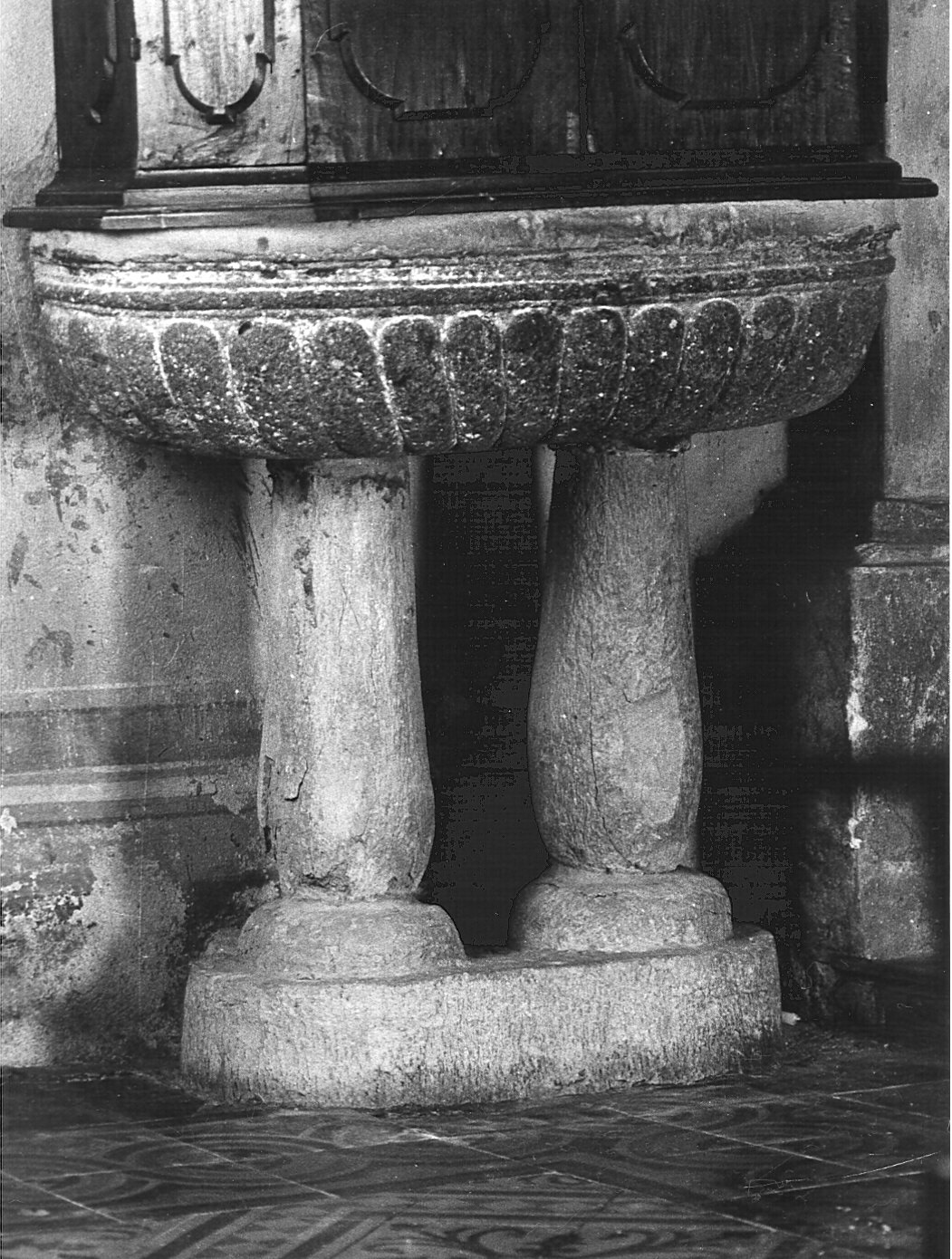 Addossata al muro, entrando nella chiesa a sinistra. La nave reca scolpito un motivo a baccelli per i tre quarti anteriori. Sopra il motivo della cornice tonda rilevata. Colonne modellate a intero rilievo. Internamente la nave è divisa in due vasche. Ha tamburo ligneo. La nave è in pietra grigia, la base e le colonne sono in pietra e calcina